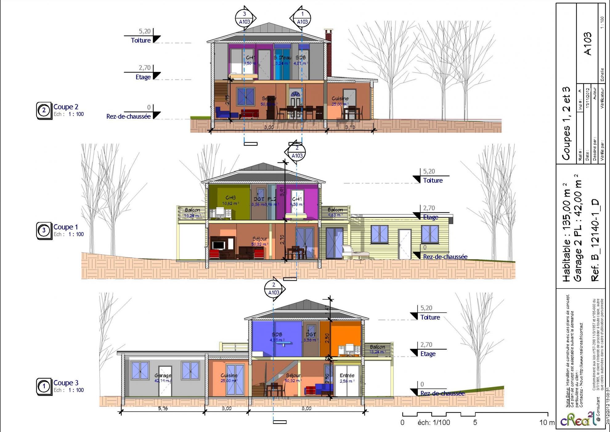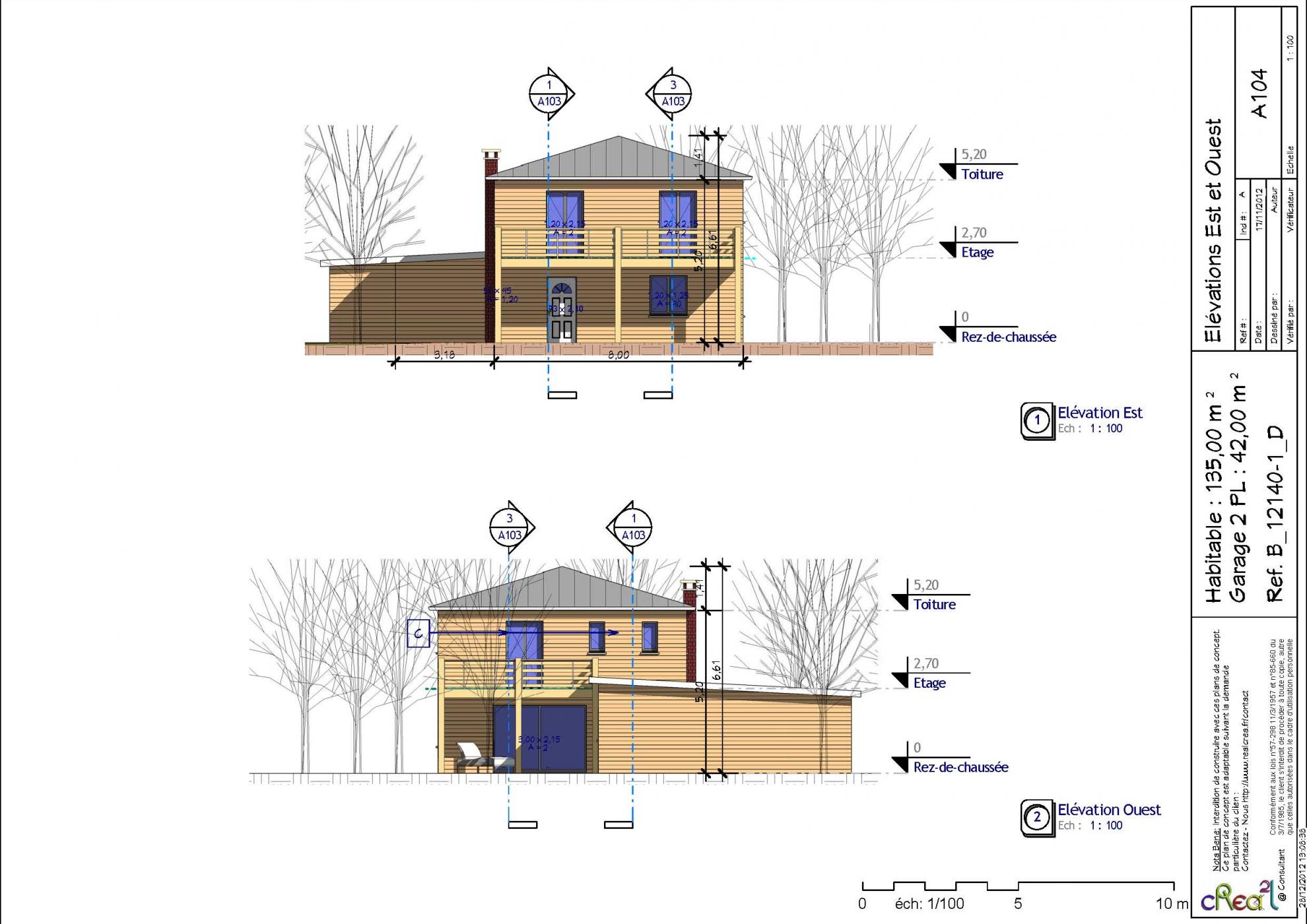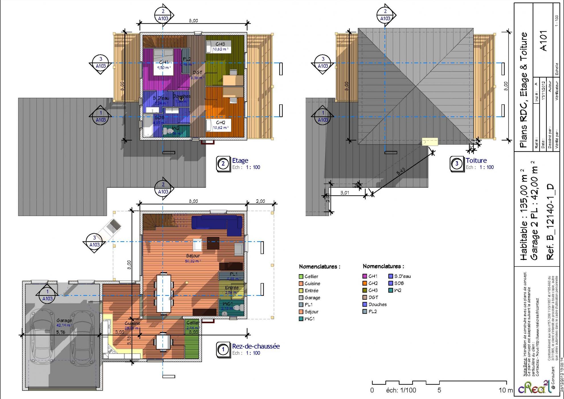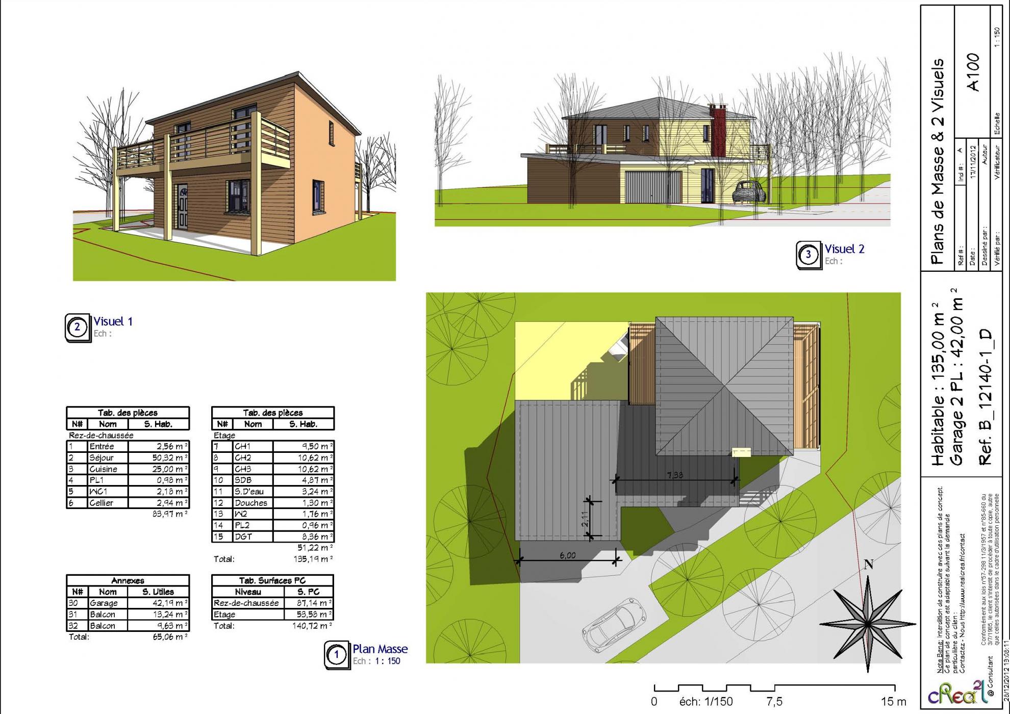 Plan B_12140-1_D : Maison moderne en bois 135 M² habitables, 2 chambres, 1 suite, grand garage à 2 places.