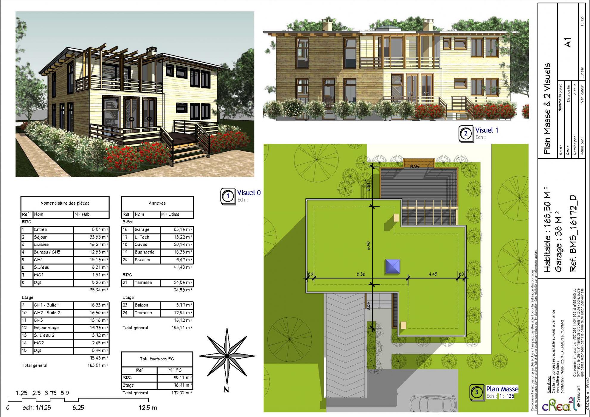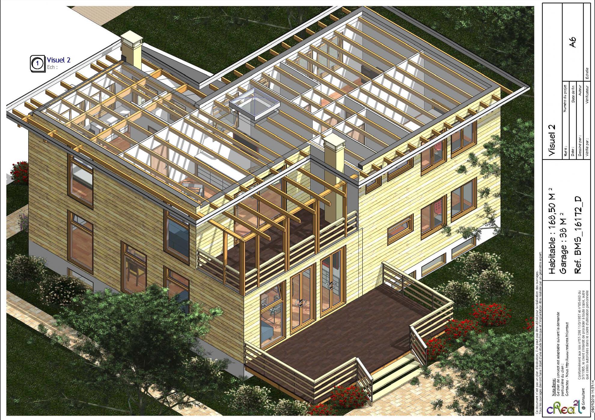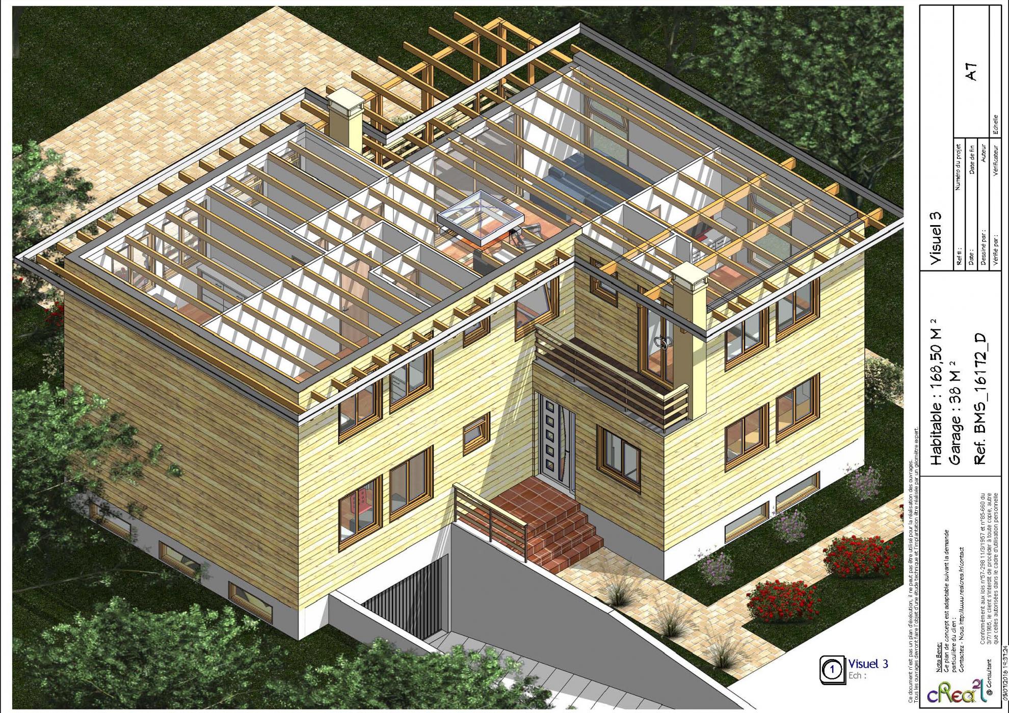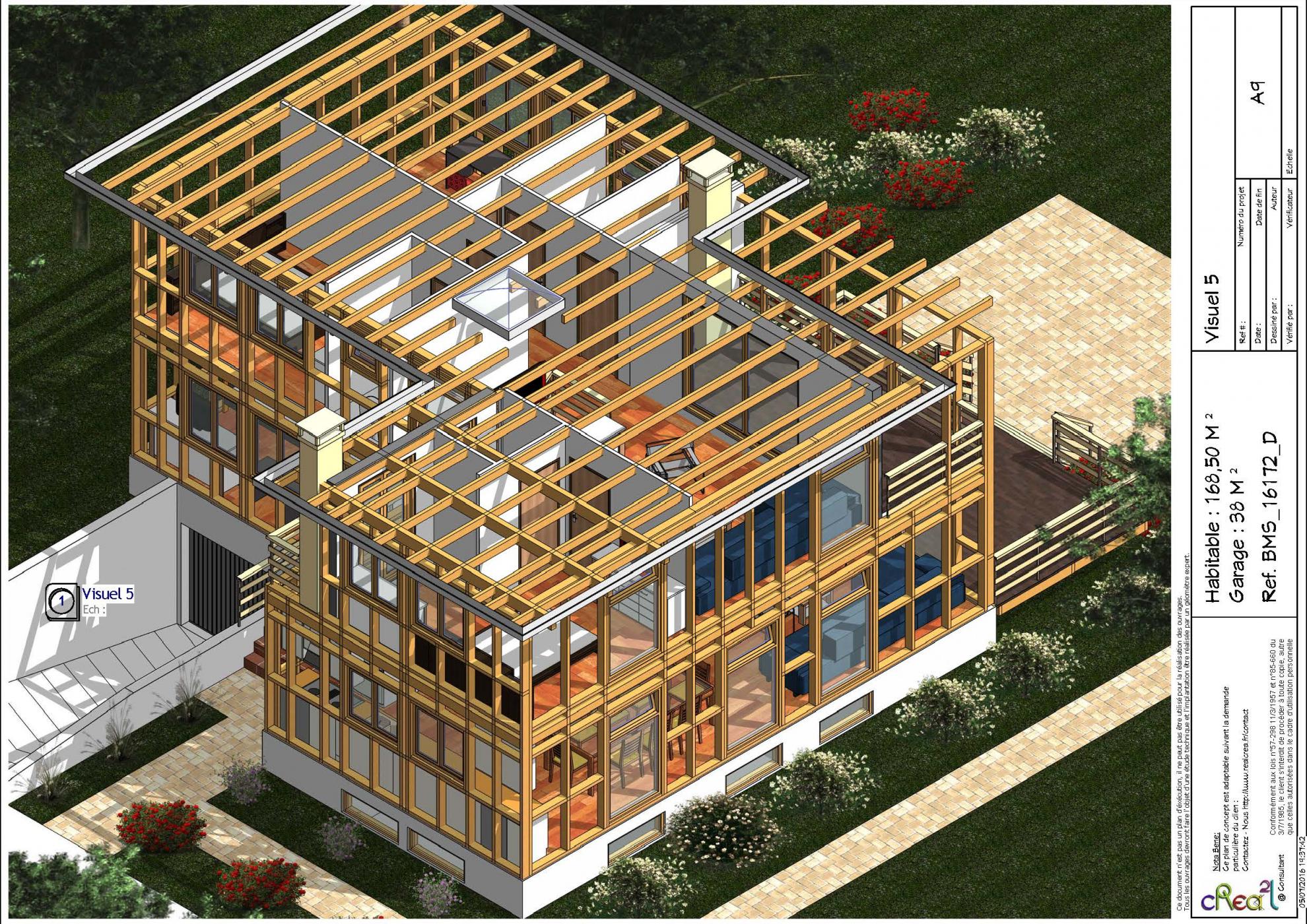 Plan BMS_16172_D : Maison en bois contemporaine, T5, 168 m², Grand séjour, Cuisine ouverte, 2 suite parentales, 3 chambres et grand garage en sous sol.
