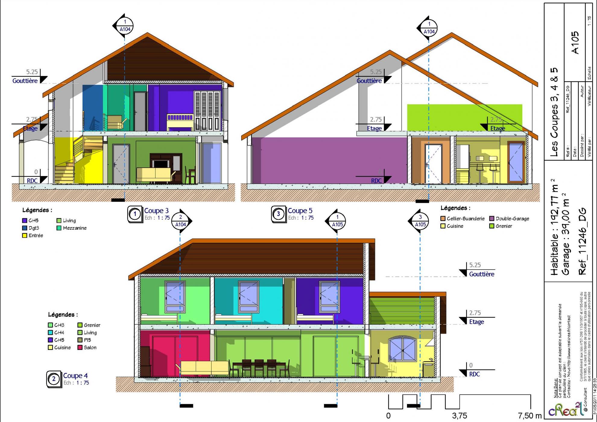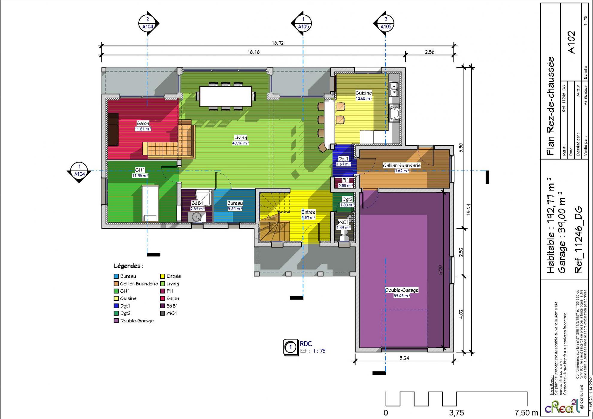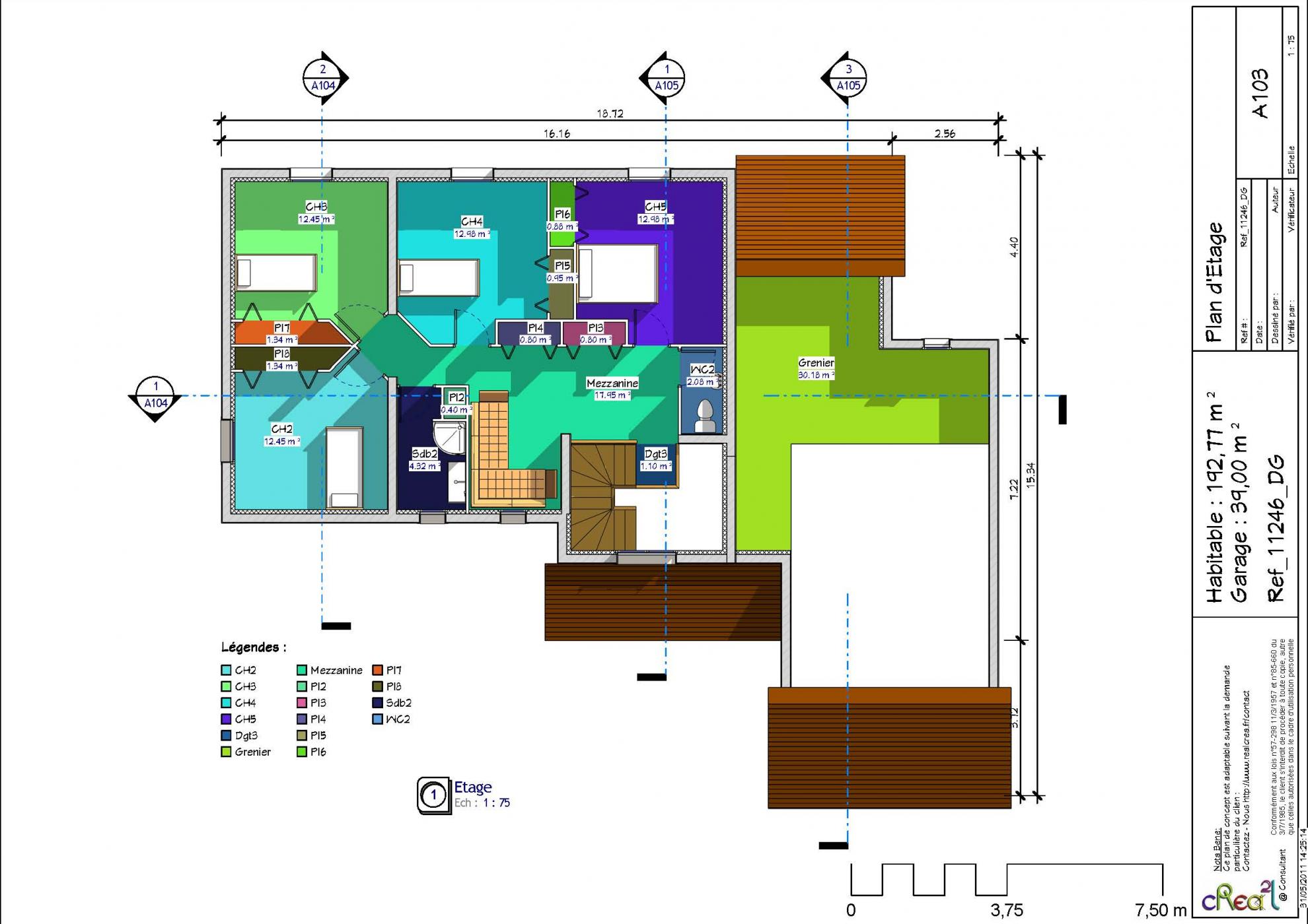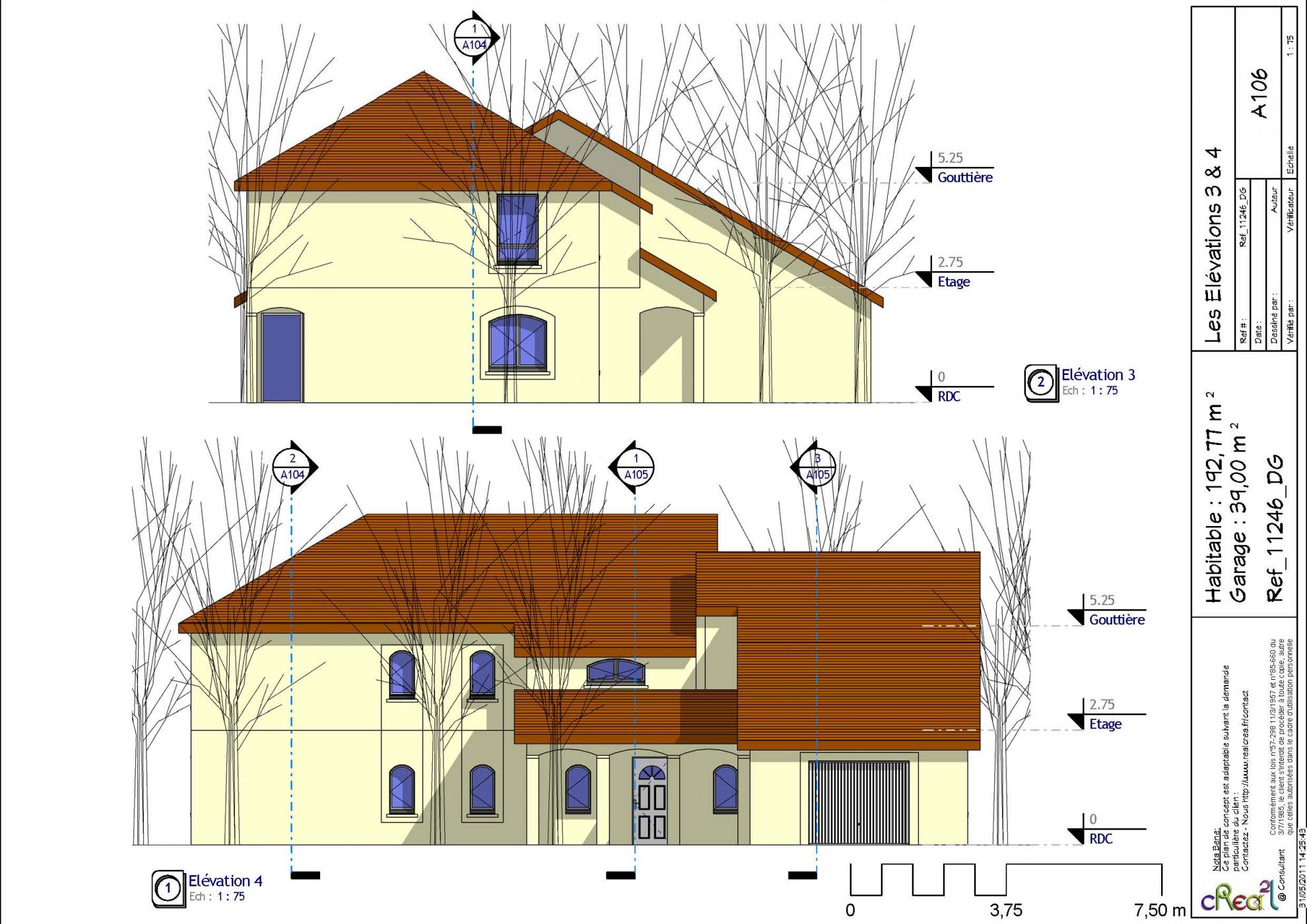 Plan 11246_DG : Maison contemporaine, R+1, 6 chambres, 192 m² habitables, double garages.