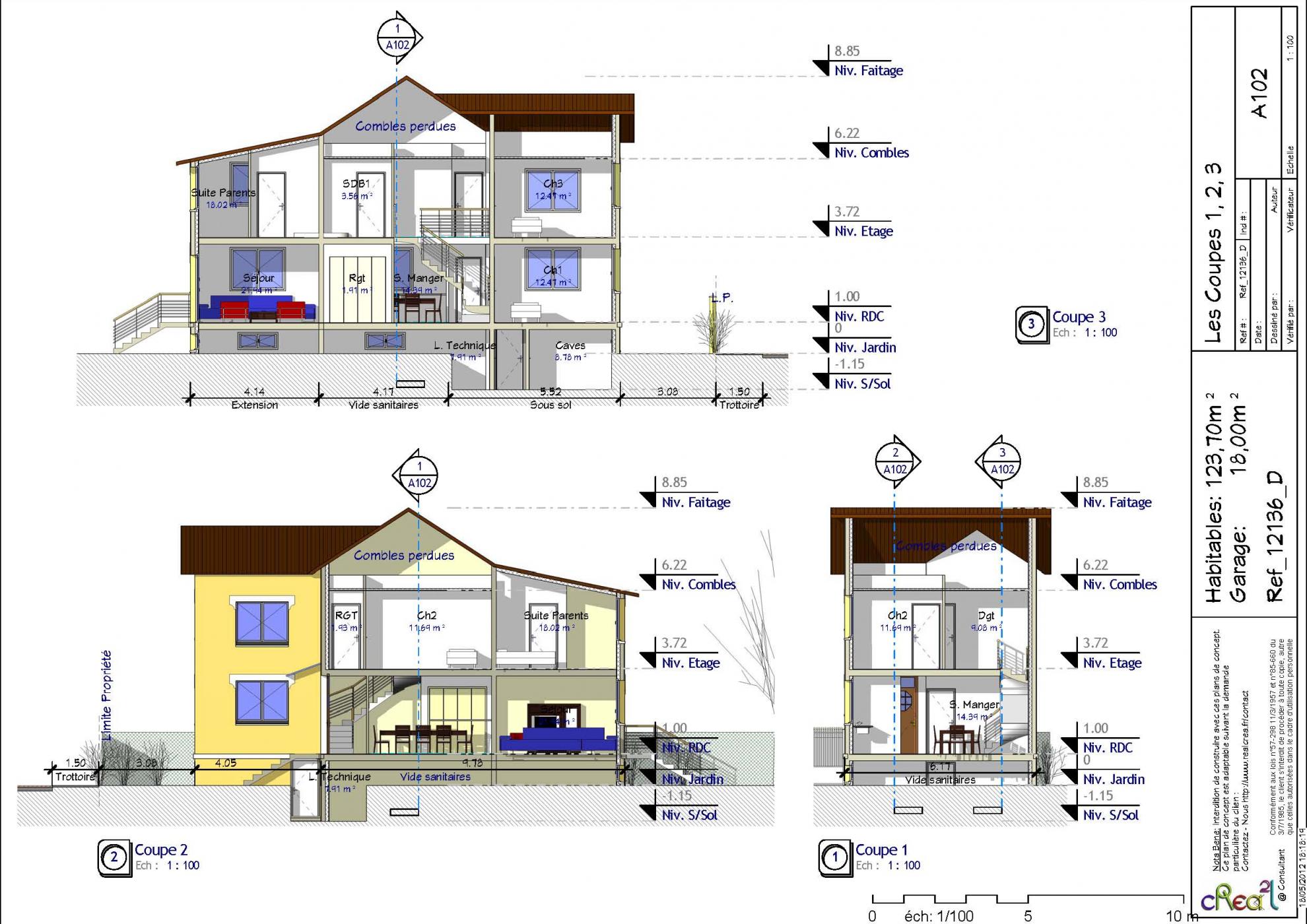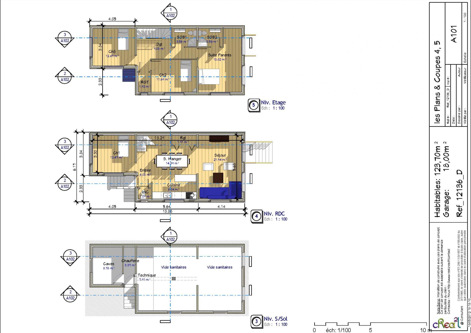 Plan 12136_D : Maison moderne, R+1+SS, 124 m², 1 suite parentale, 3 chambres, sous-sol, garage indépendant.