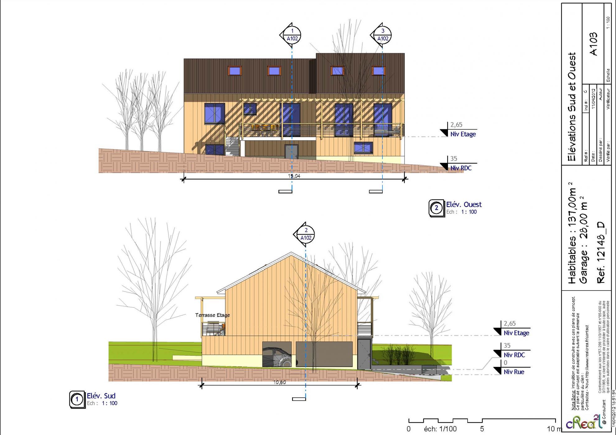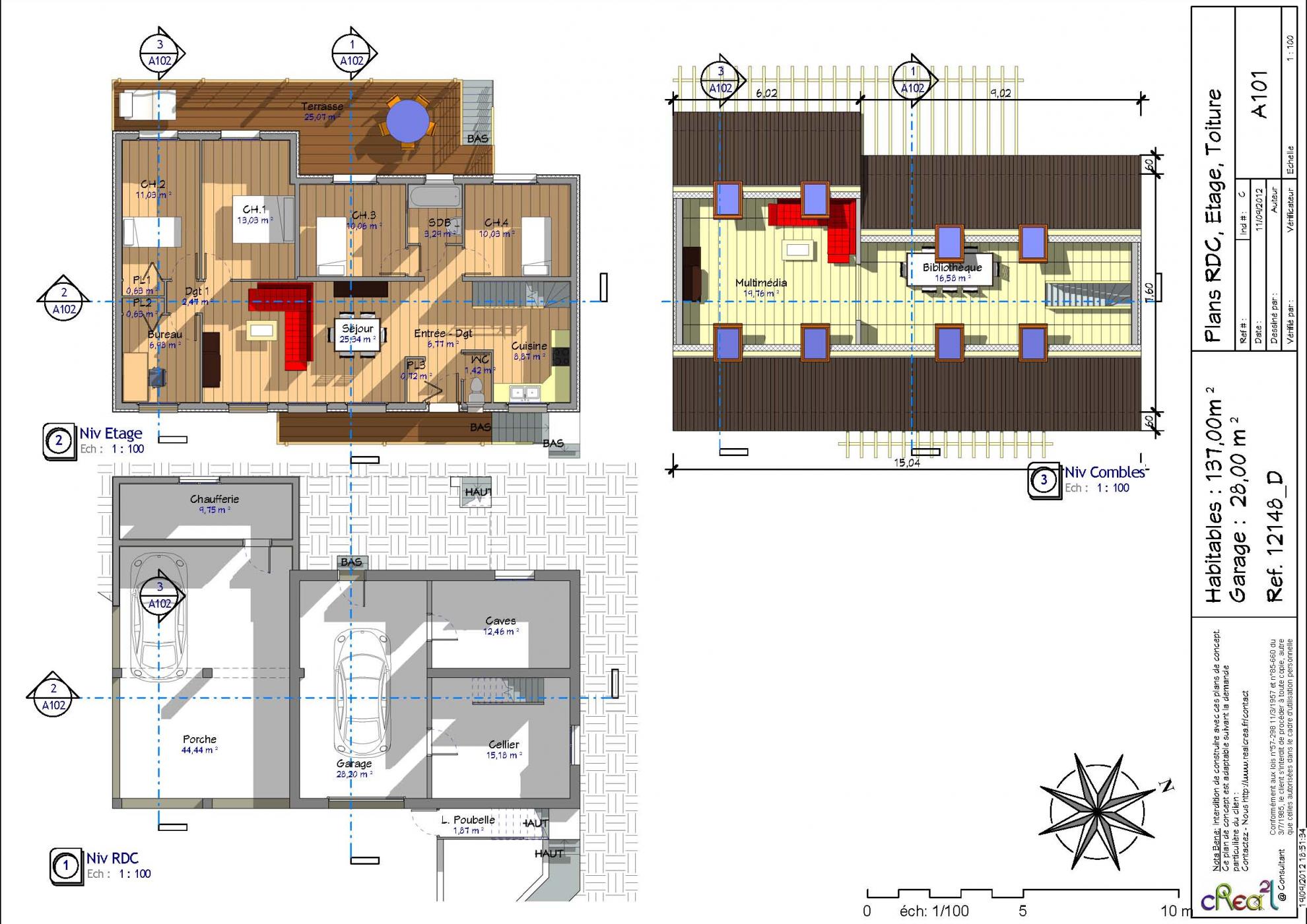 Plan 12148_D : Maison contemporaine, R+1+Combles, 4 Chambres, 137m² habitables, Grande garage intégré.