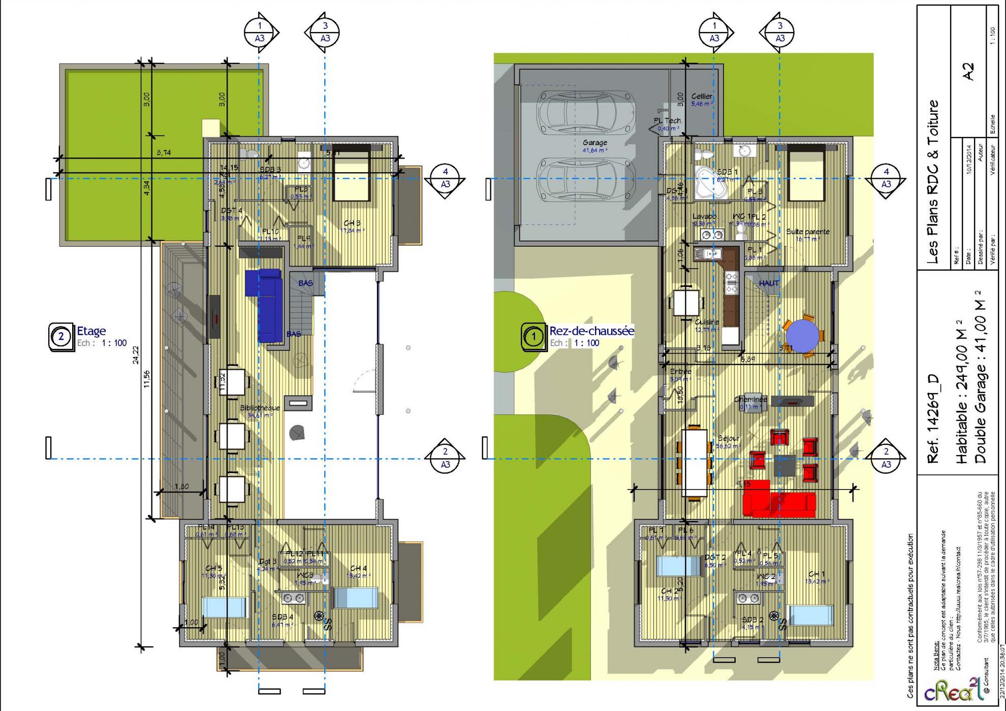 Plan 14269_D : Maison moderne R+1, T7, 240 M², Grand Garage intégré.