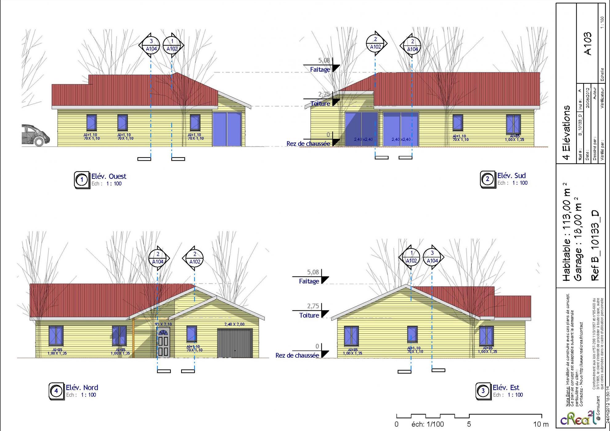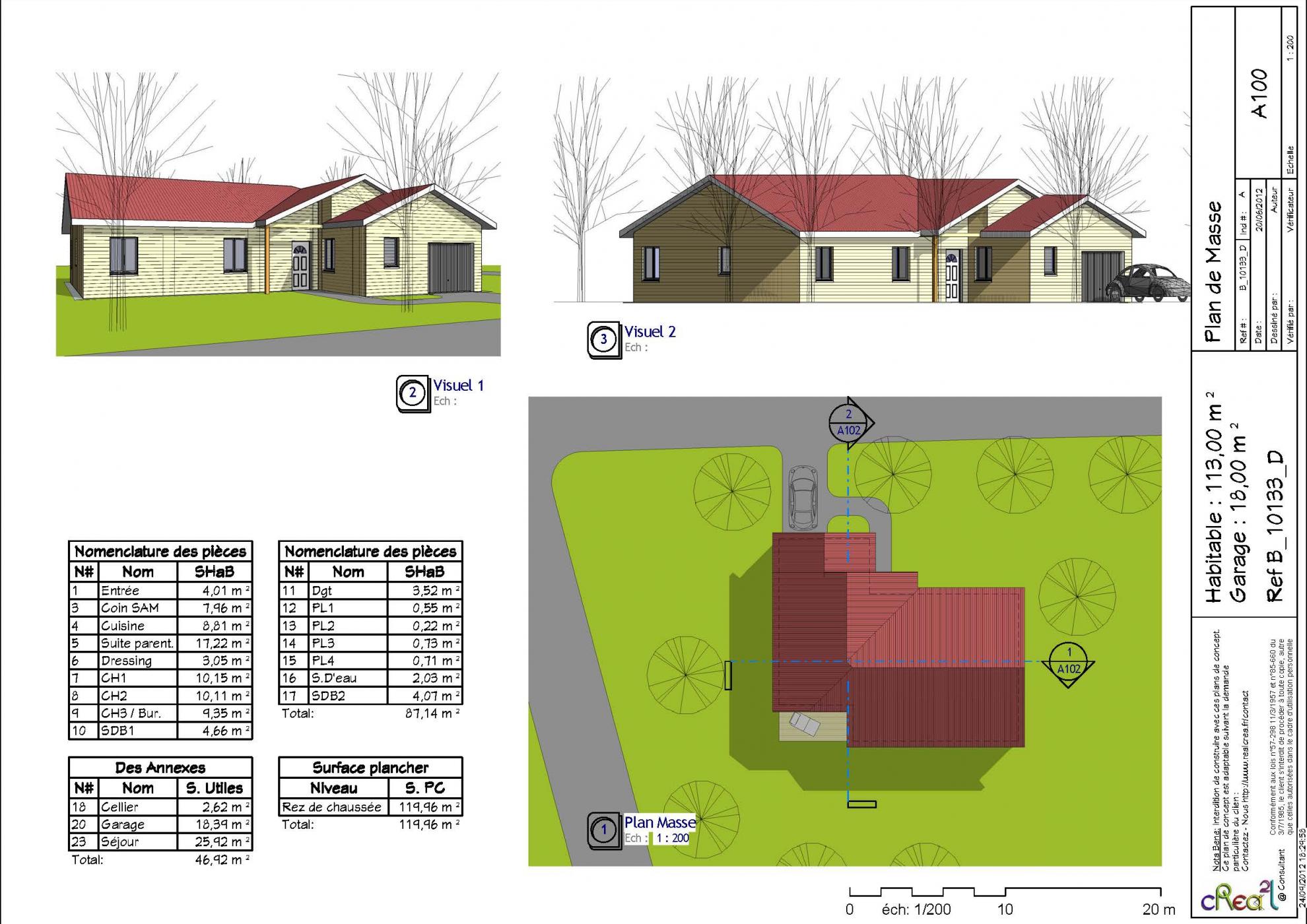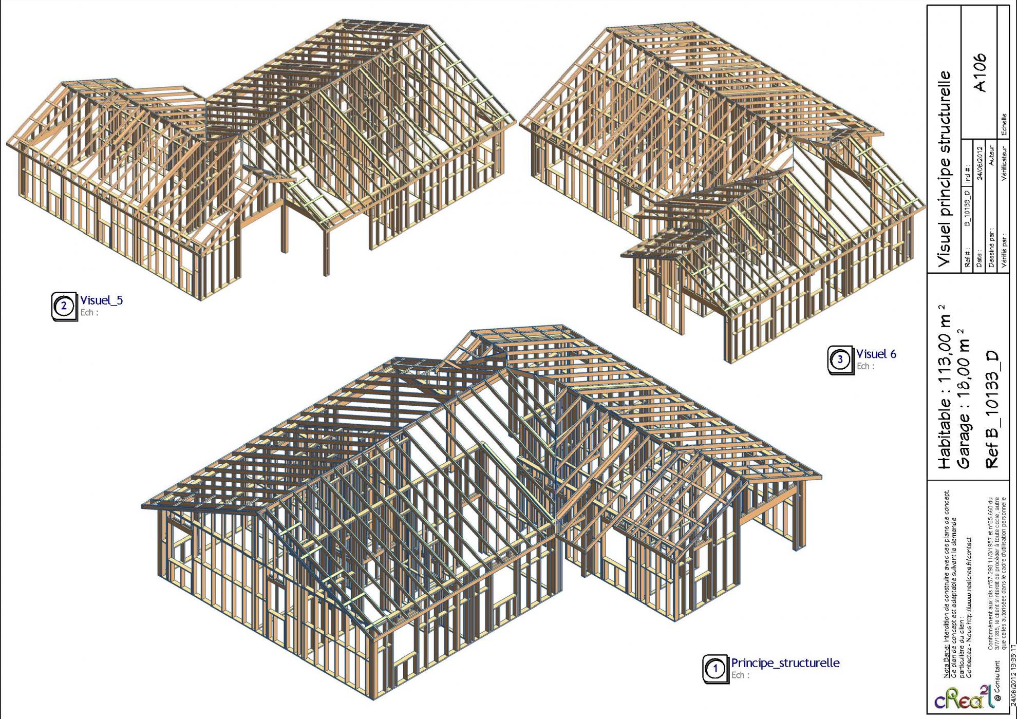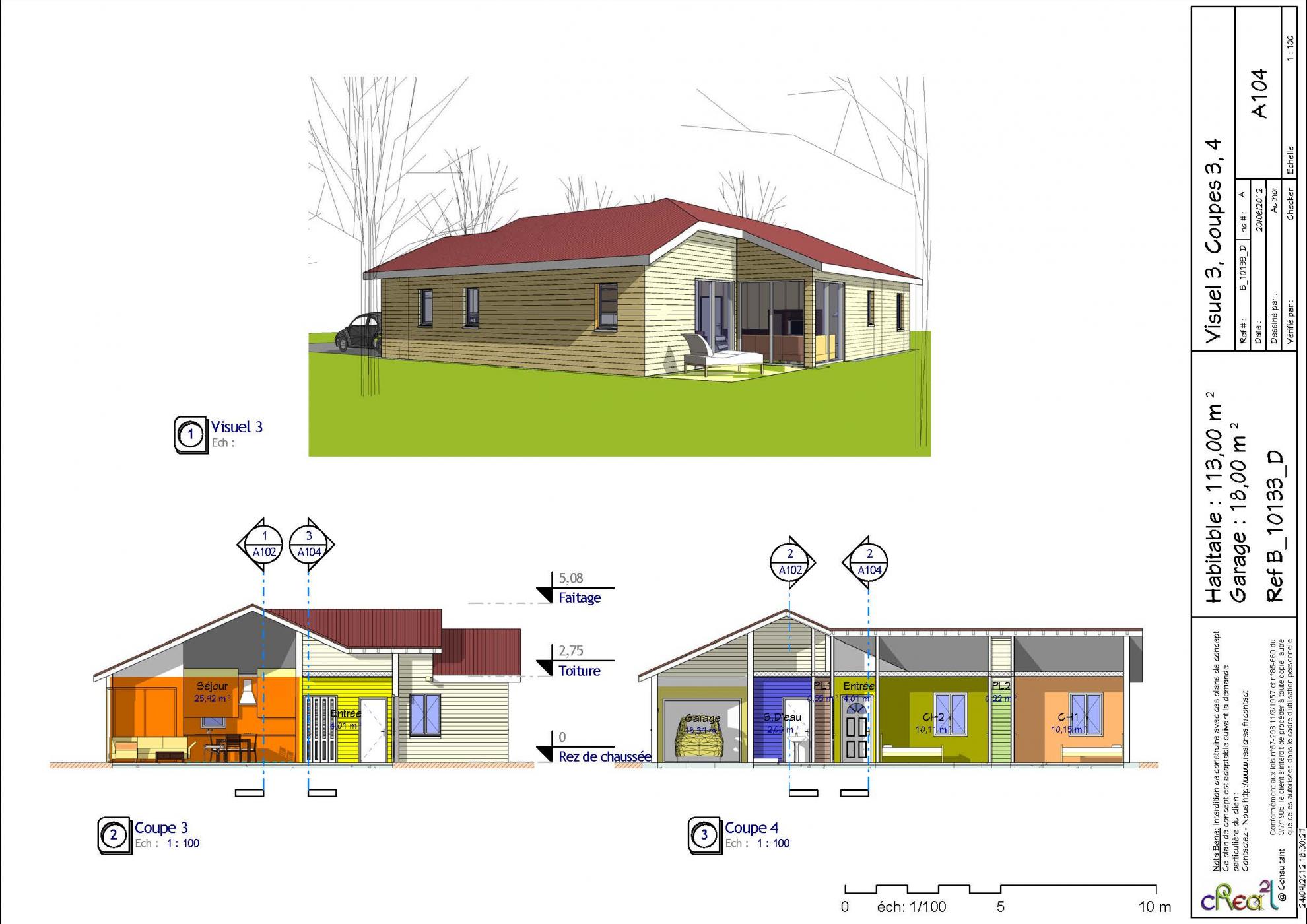 Plan B_10133_D : Maison bois plain-pied, 4 chambres ayant 116 m² habitables et garage intégré.