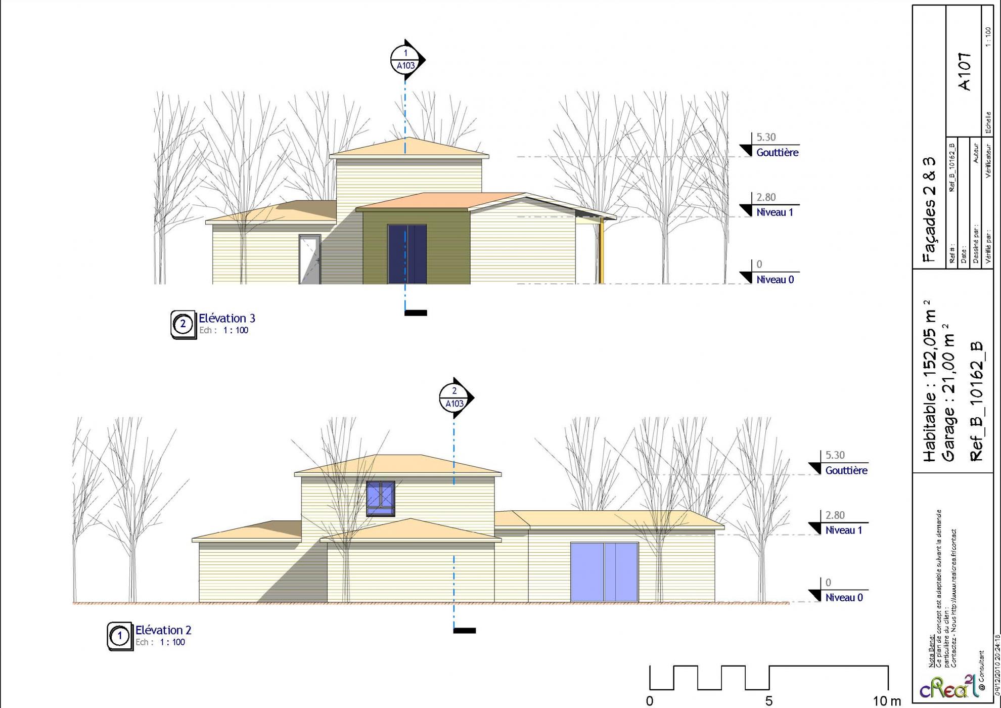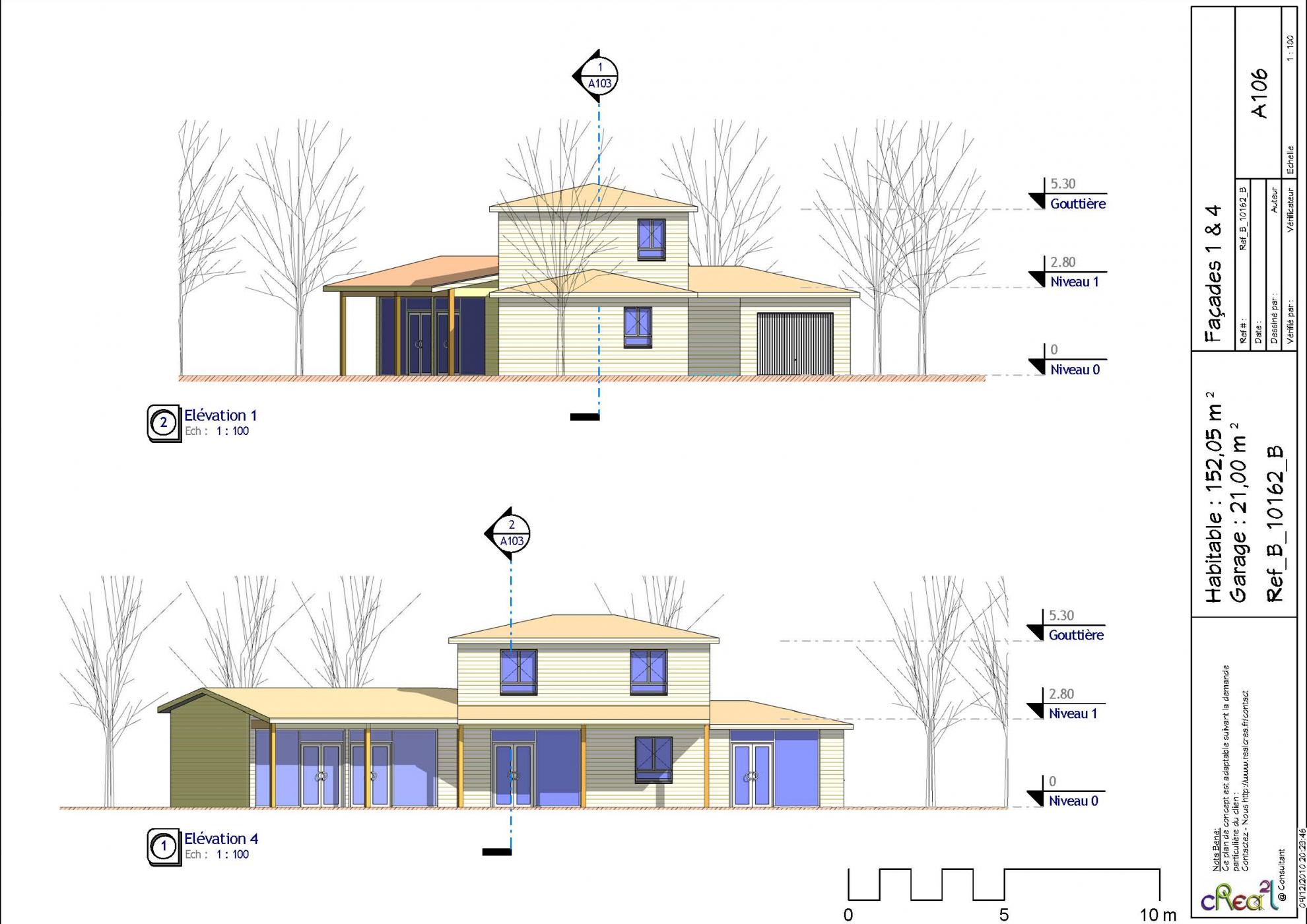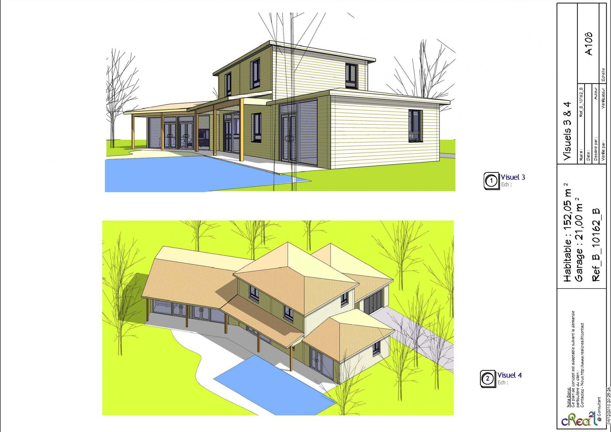 Plan B_10162_D : Maison en bois, 2 chambres, Suite parentale, 152 m² habitables + Garage intégré.