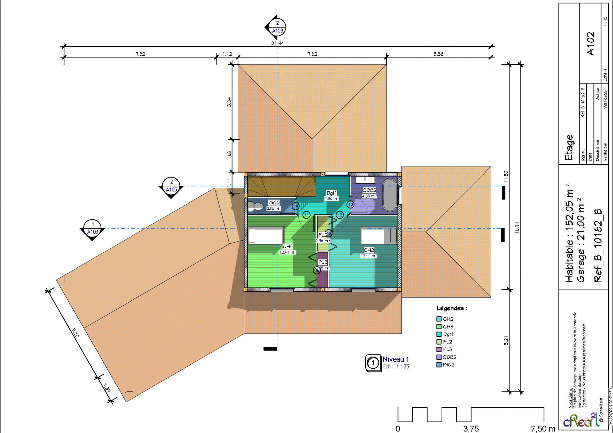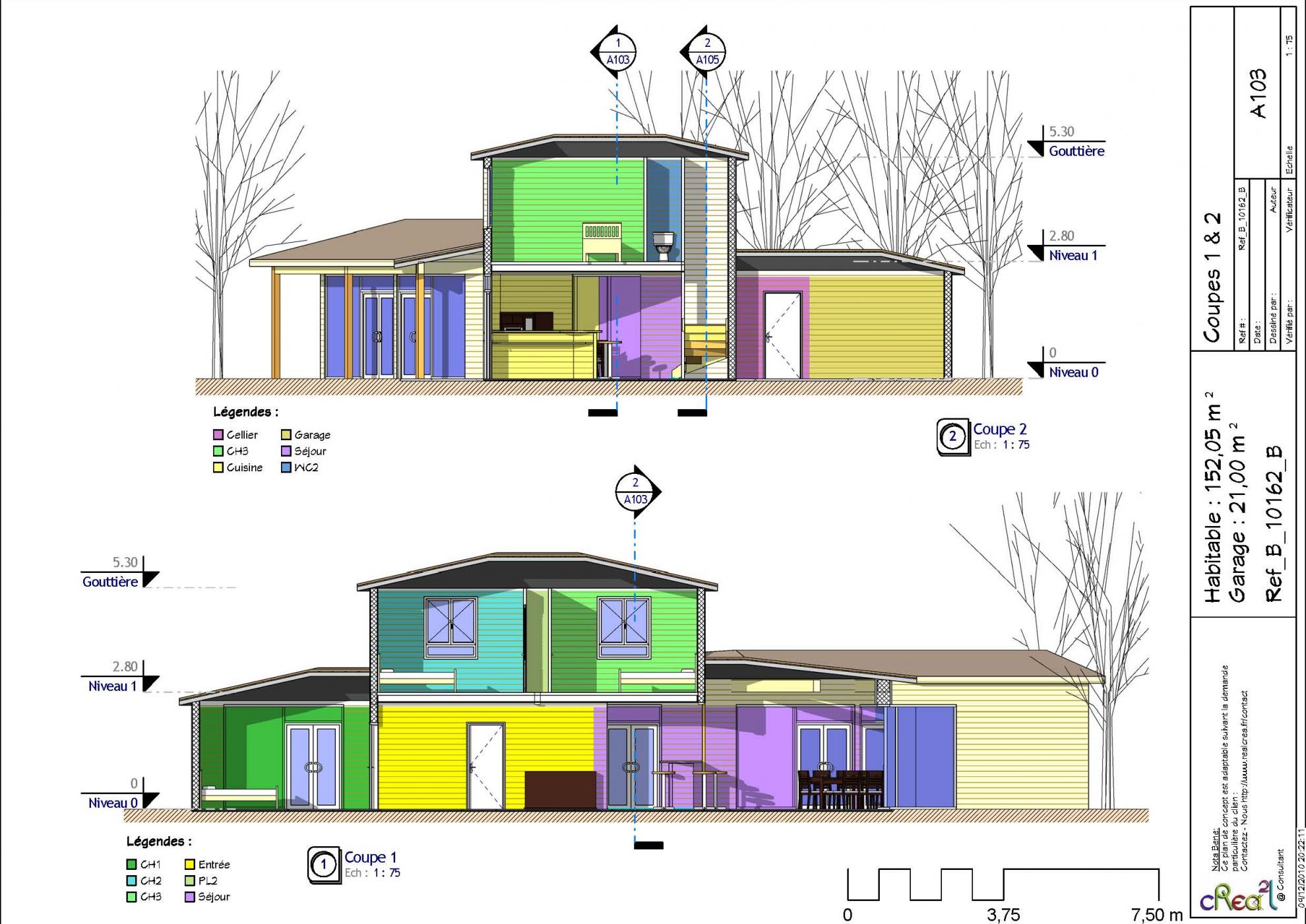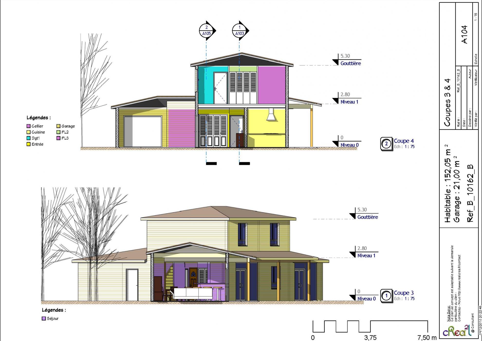 Plan B_10162_D : Maison en bois, 2 chambres, Suite parentale, 152 m² habitables + Garage intégré.
