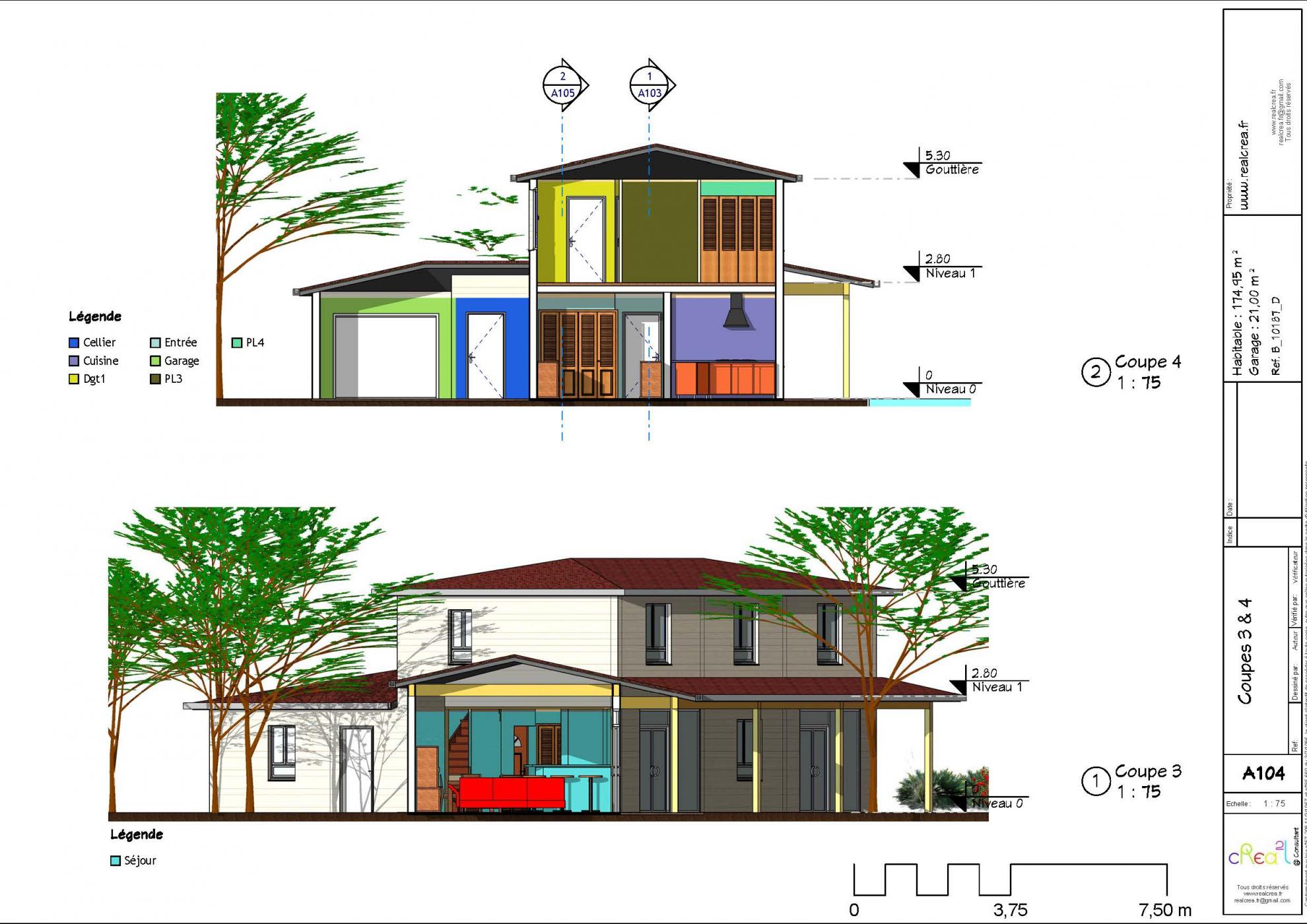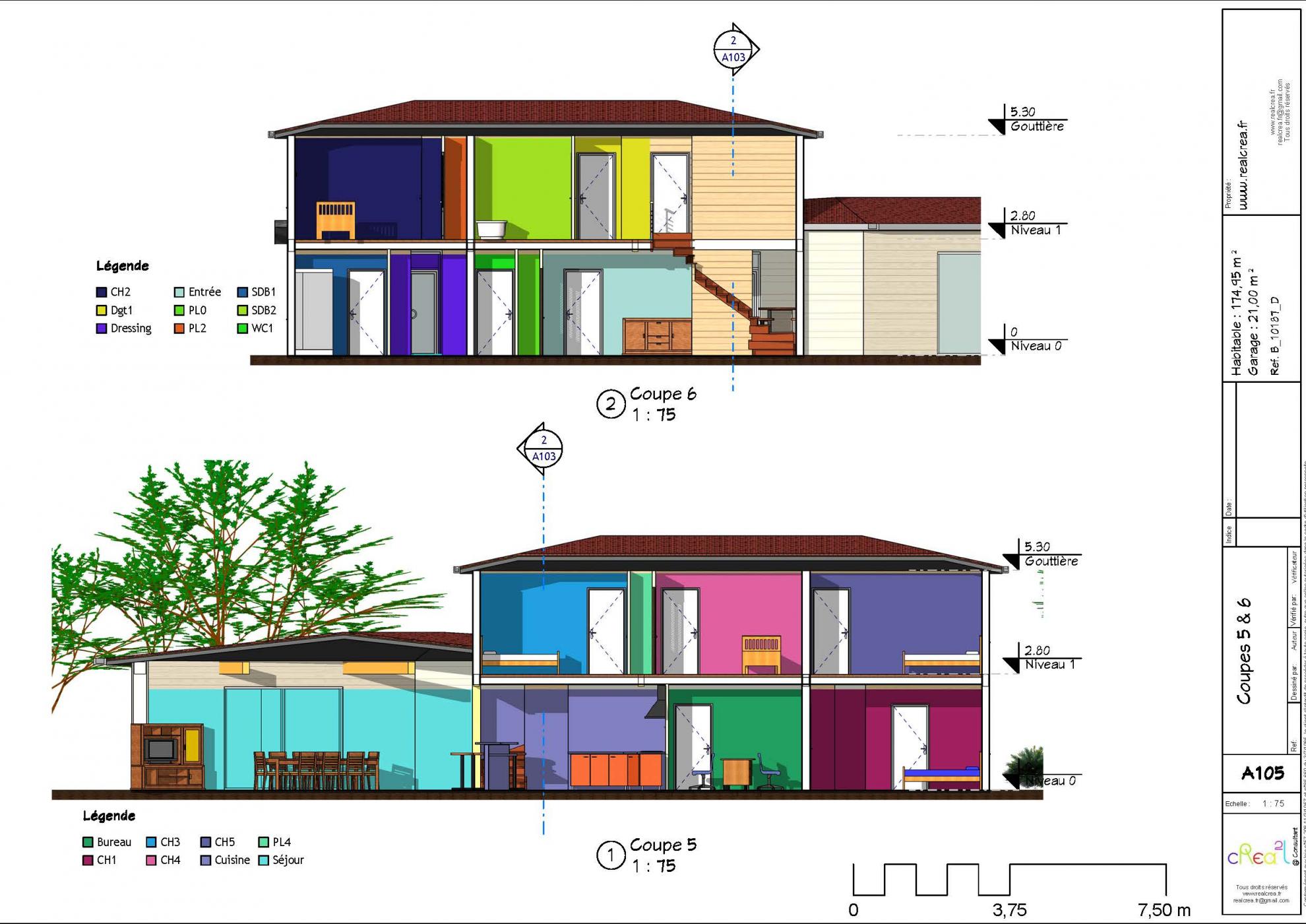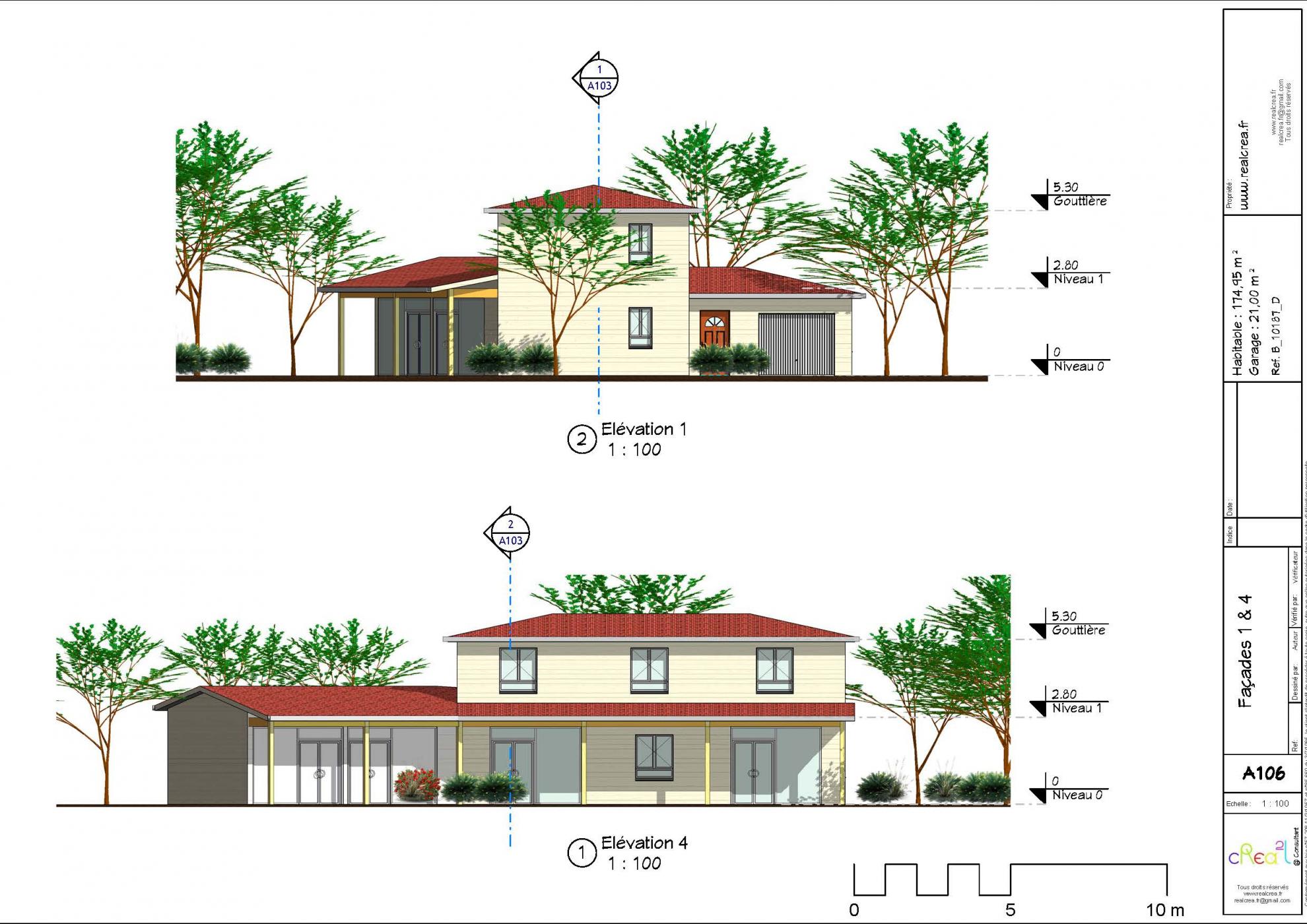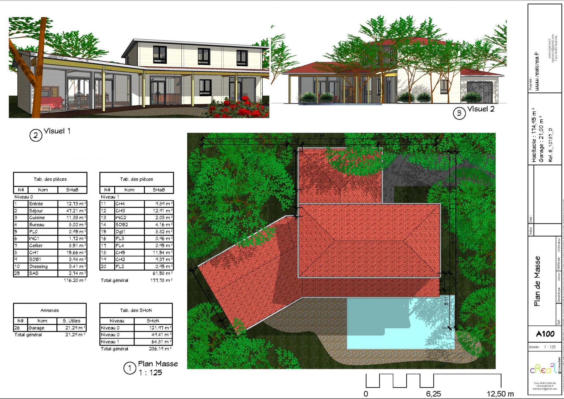 Plan B_10187_D : Maison en construction bois, r+1, 175 m² habitable avec le grand séjour traversant avec terrasse et la piscine, 1 suite à rdc et 4 chambres à étage ... garage 2 voiture.