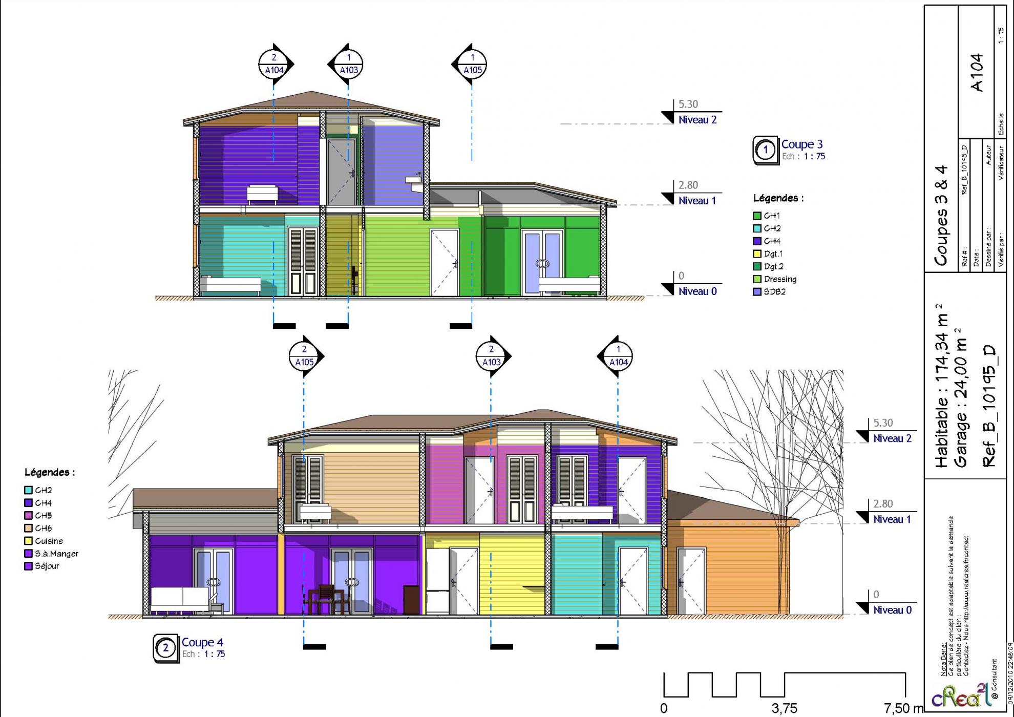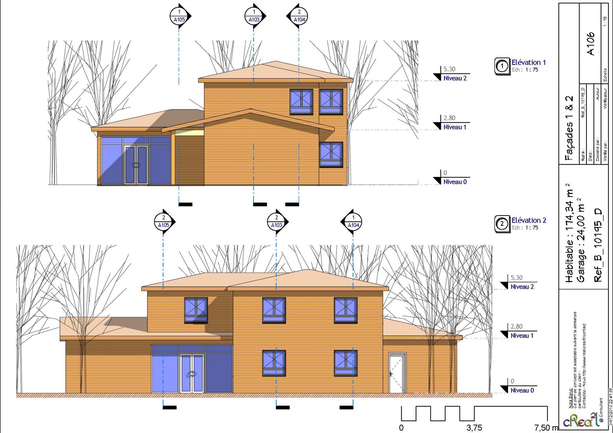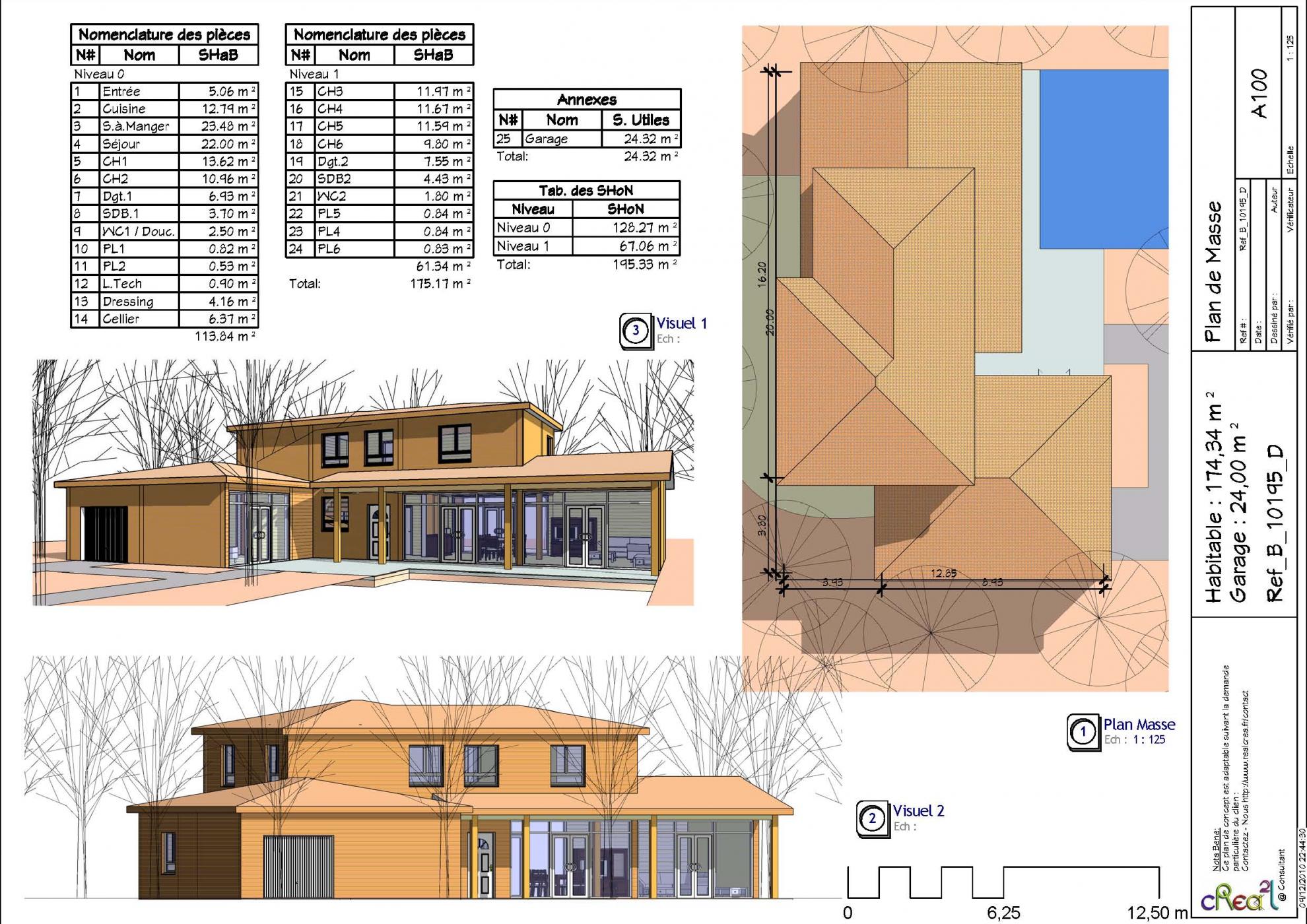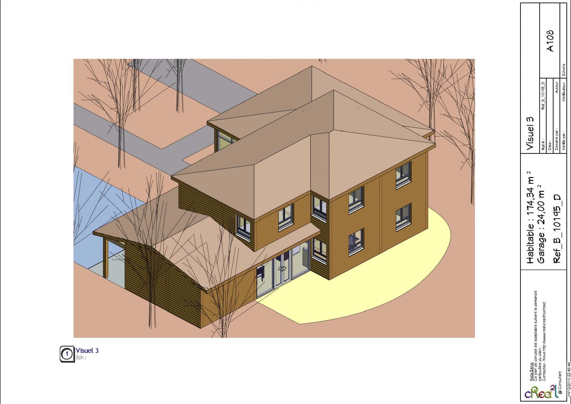 Plan B_10195_D : Maison en bois 5 chambres, 1 suite, 174 m² habitables + Garage intégré.