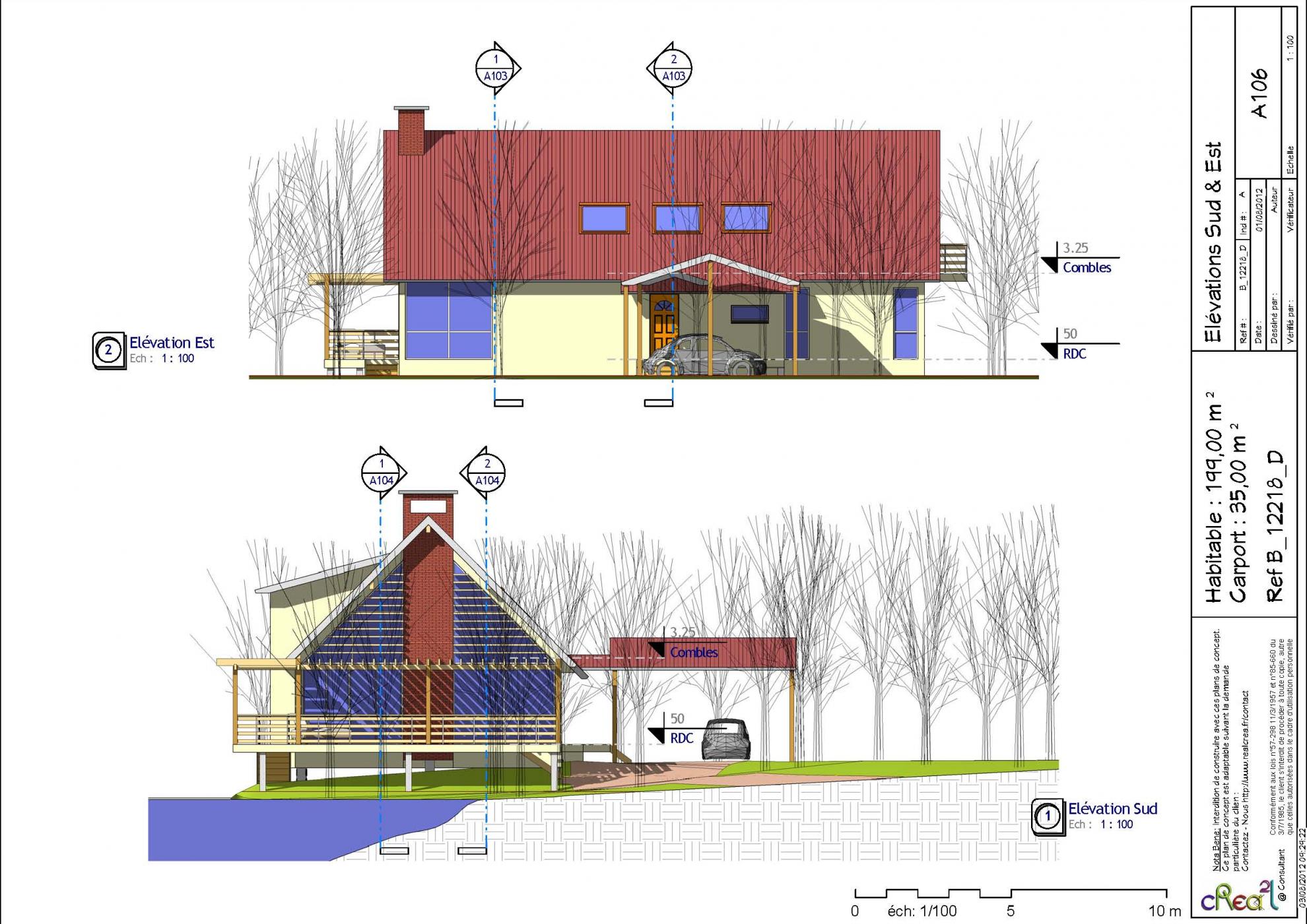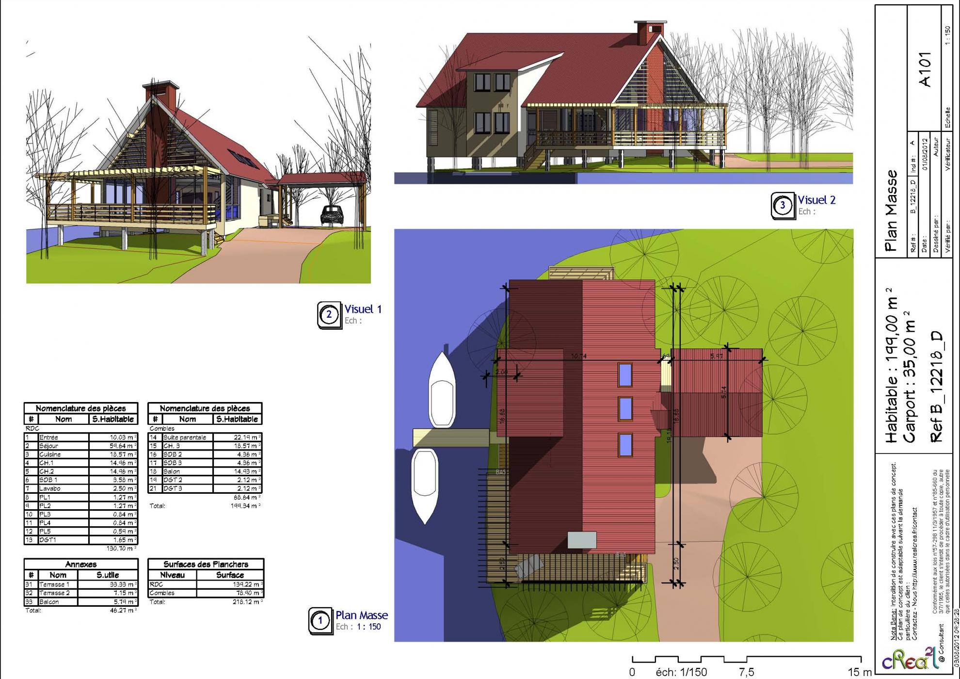 Plan B_12218_D : Maison moderne en bois sur piloti, 3 chambres, 1 suite, 200 m² habitable + grand carport