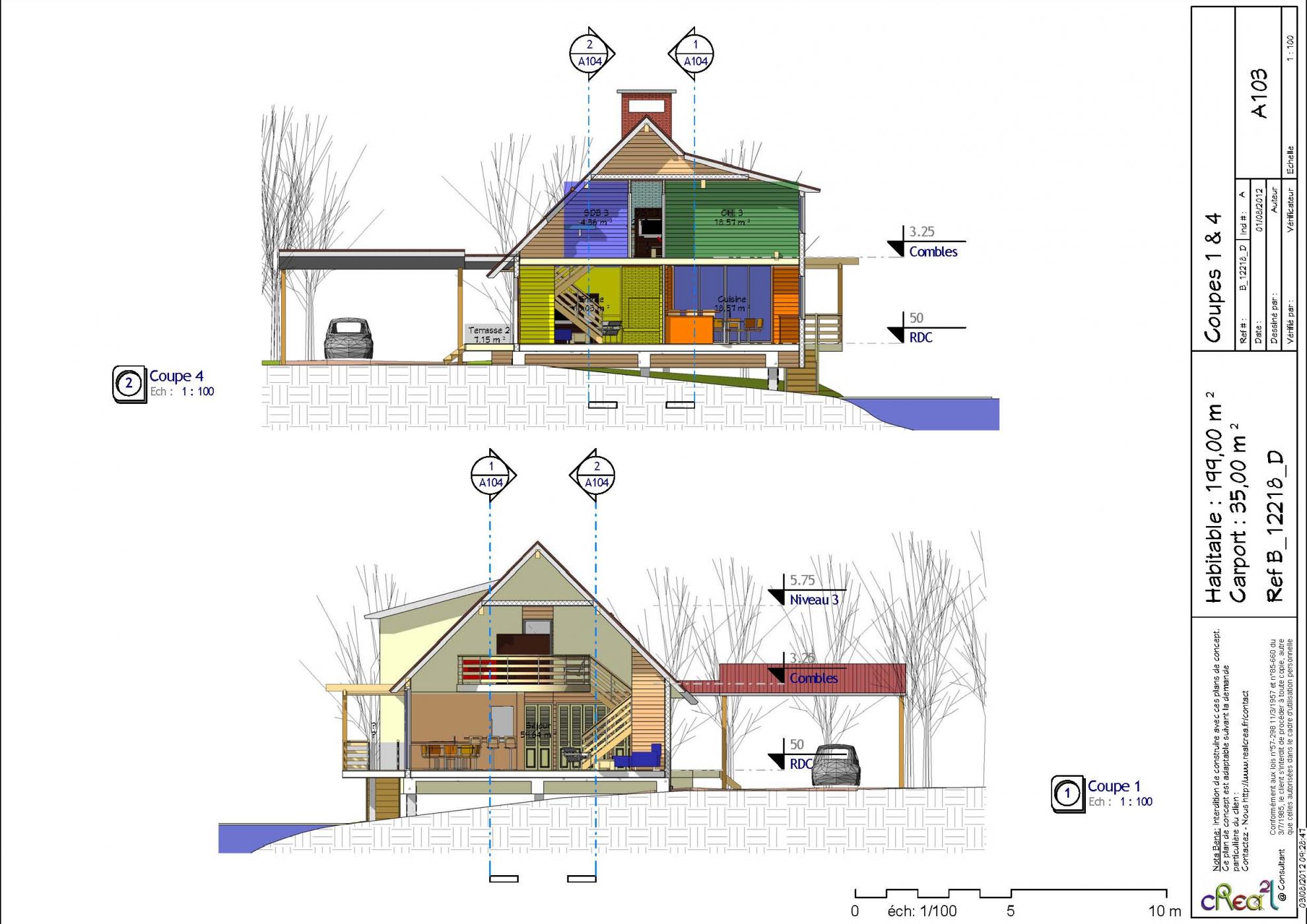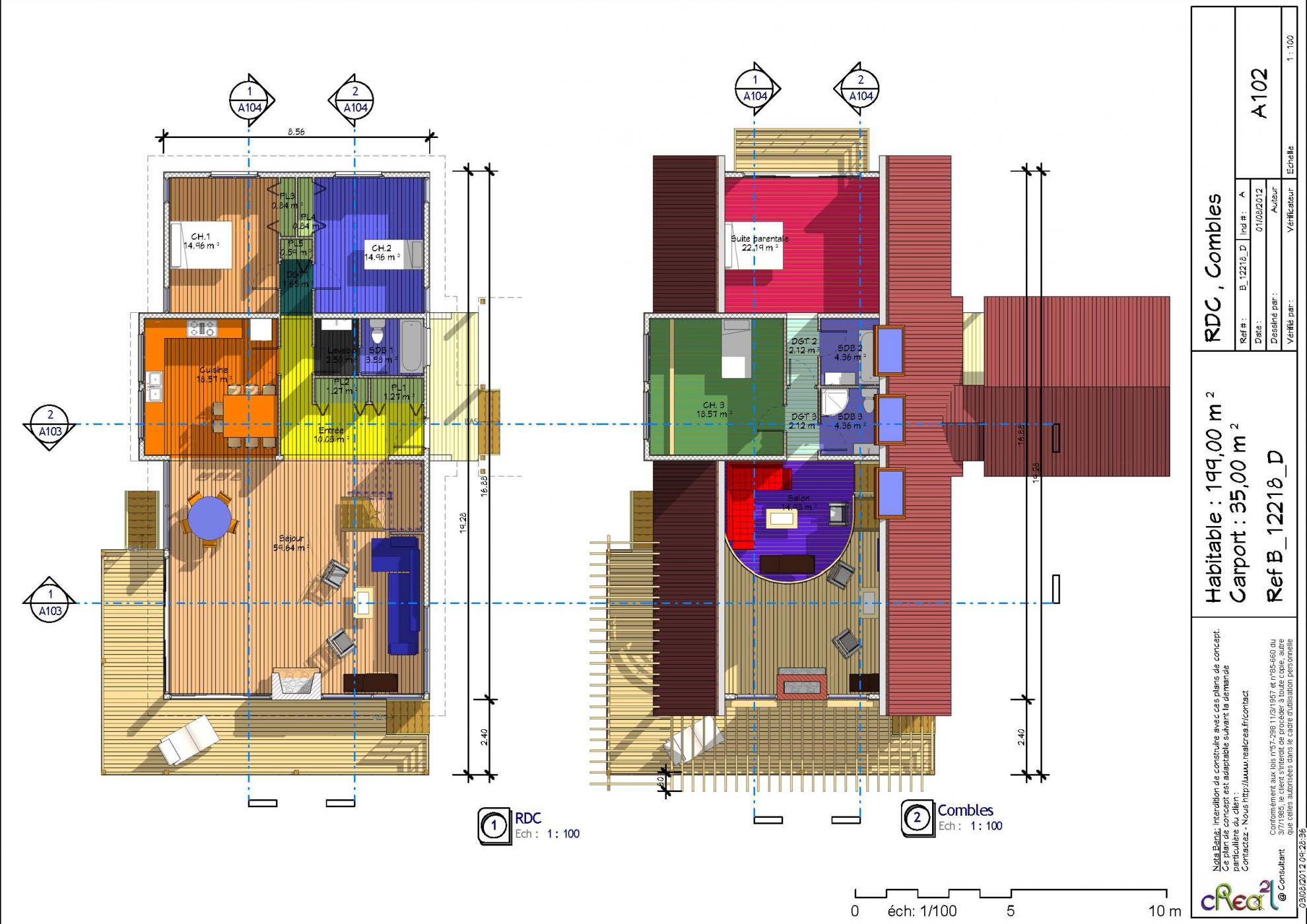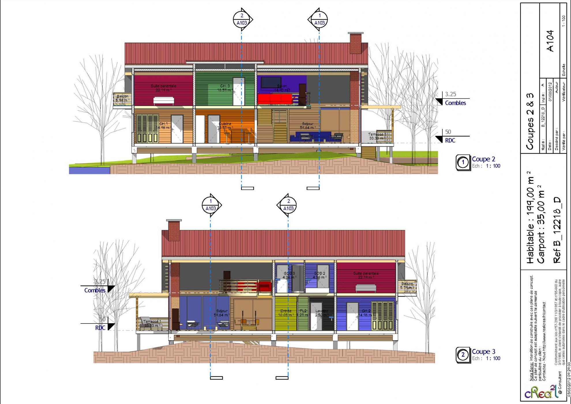Plan Co_14183_D : Maison contemporaine R+1, 173 M², avec 15 Containers maritimes de 6 M, F5...