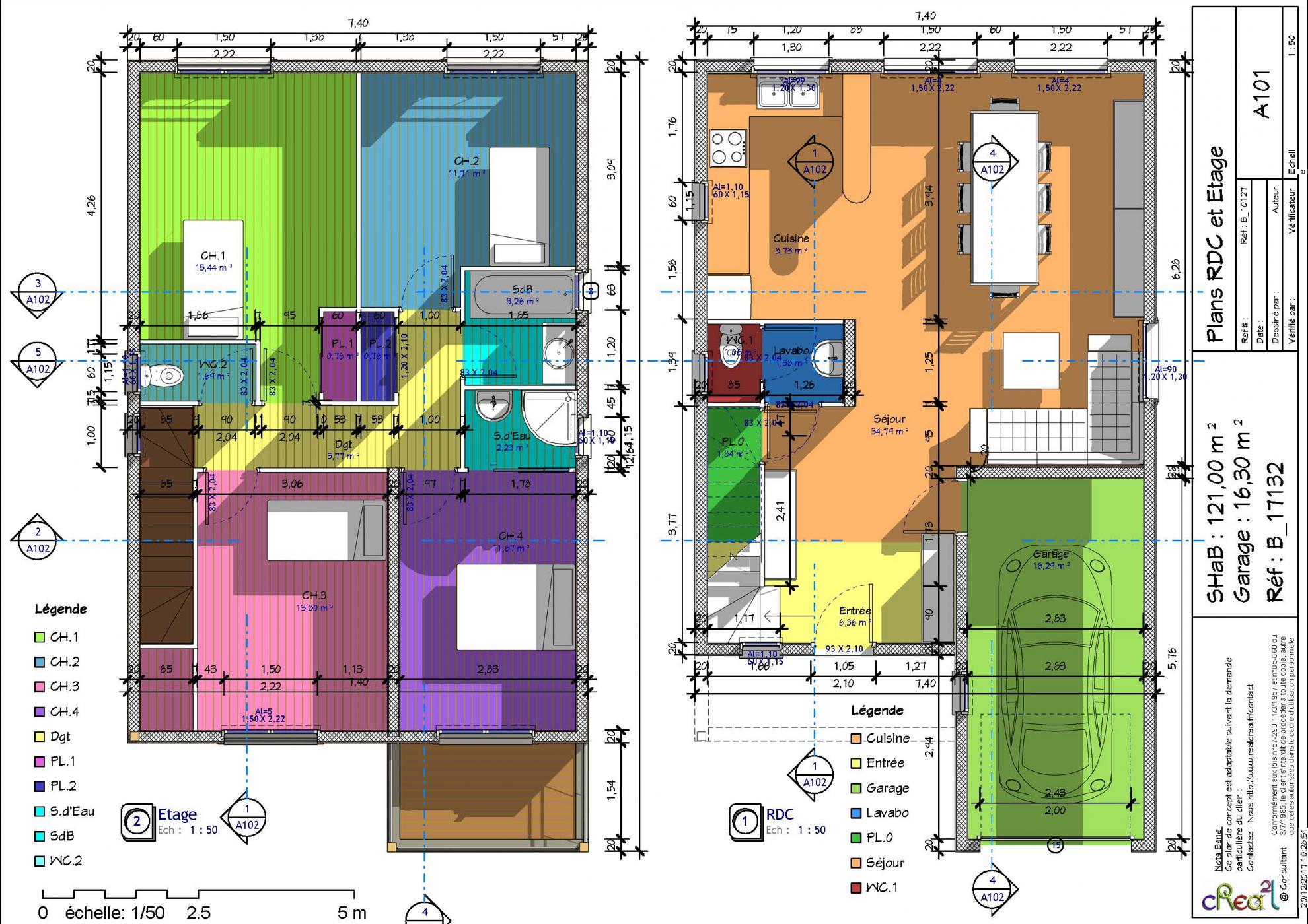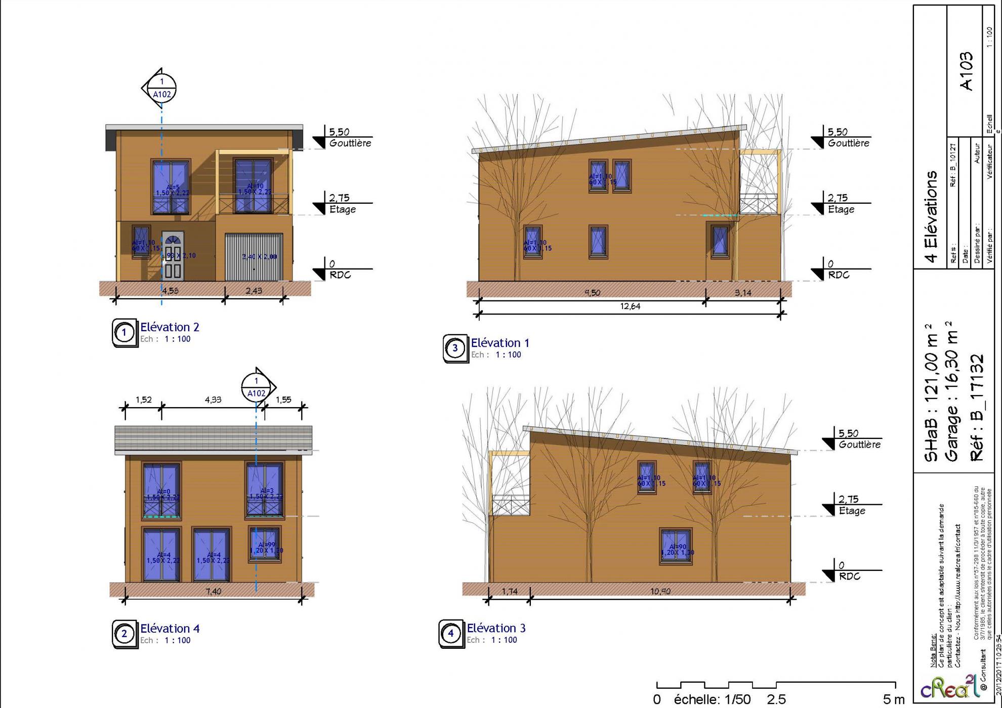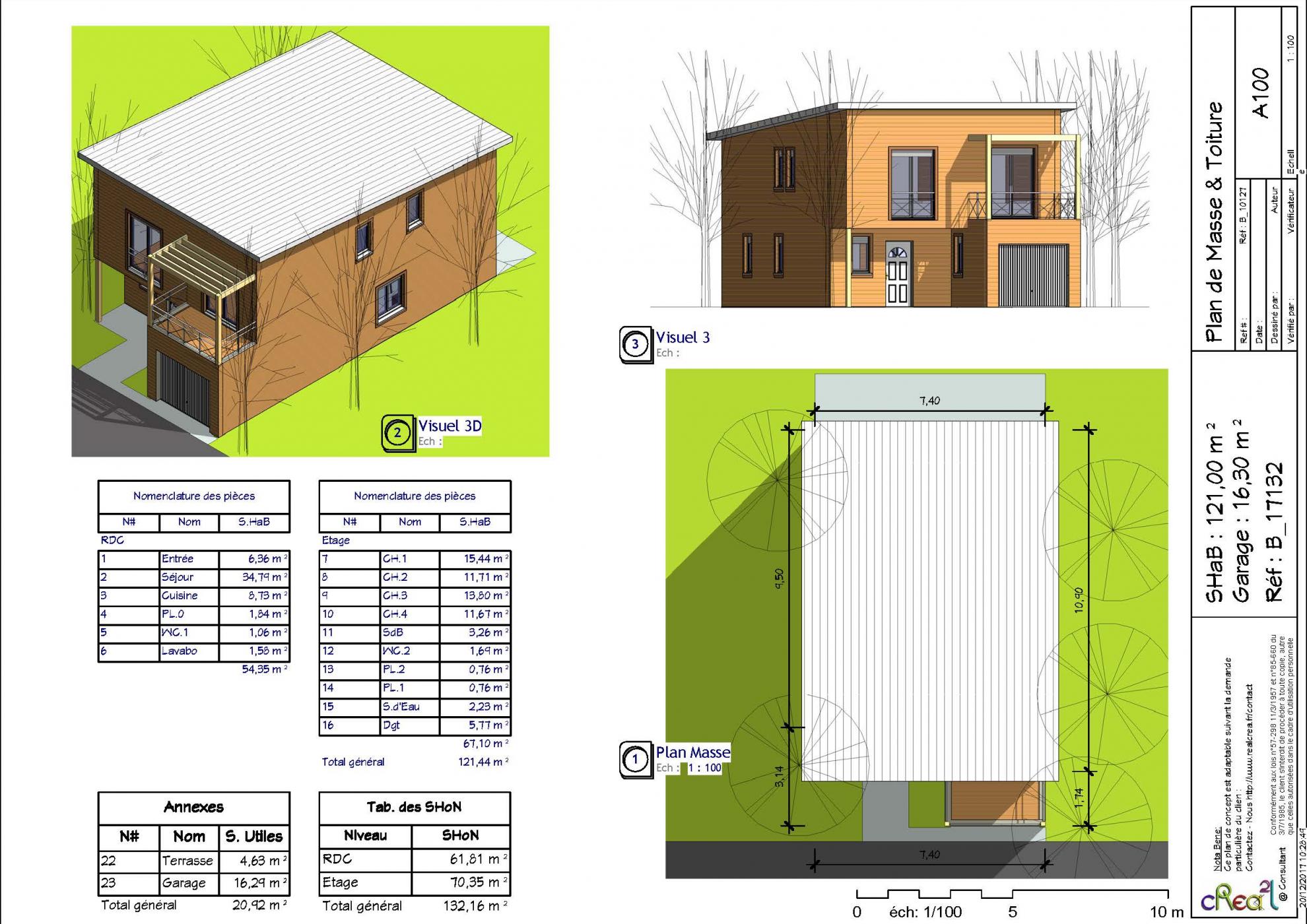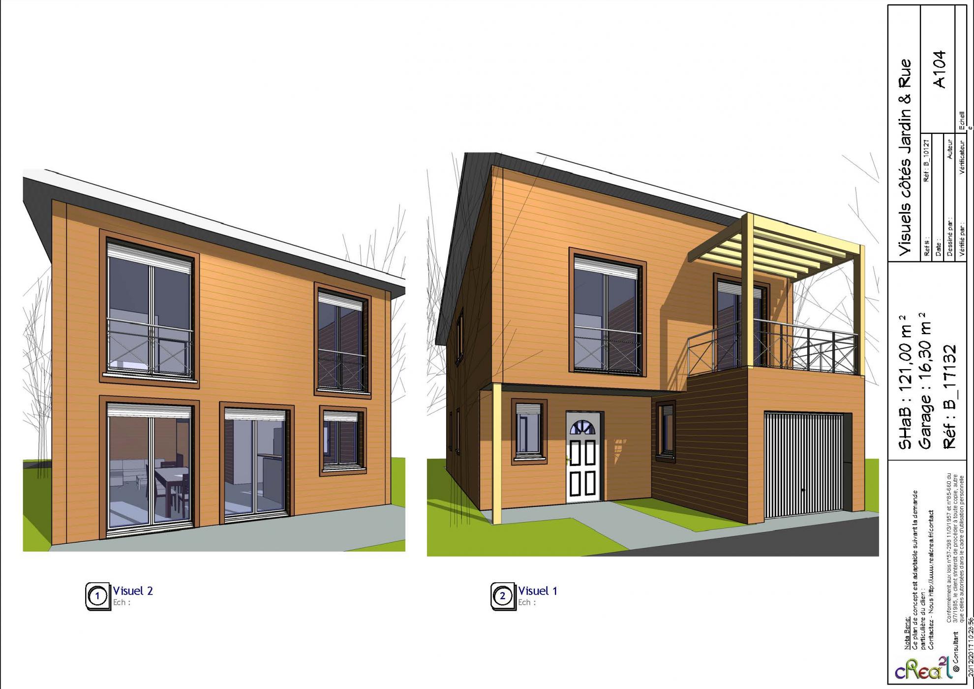 Plan B_17132 : Maison bois contemporaine R+1, 121m² avec Suite parentale, 3 Chambres et Garage