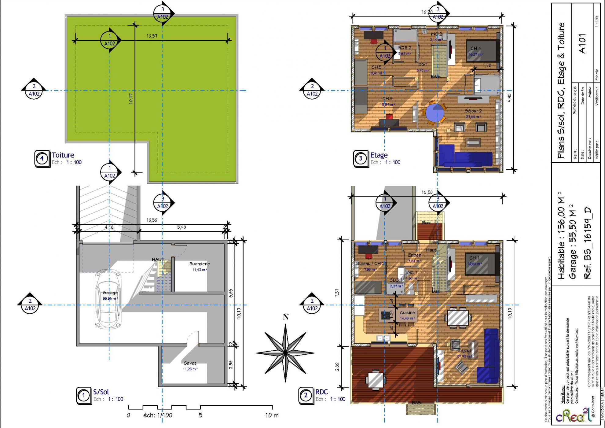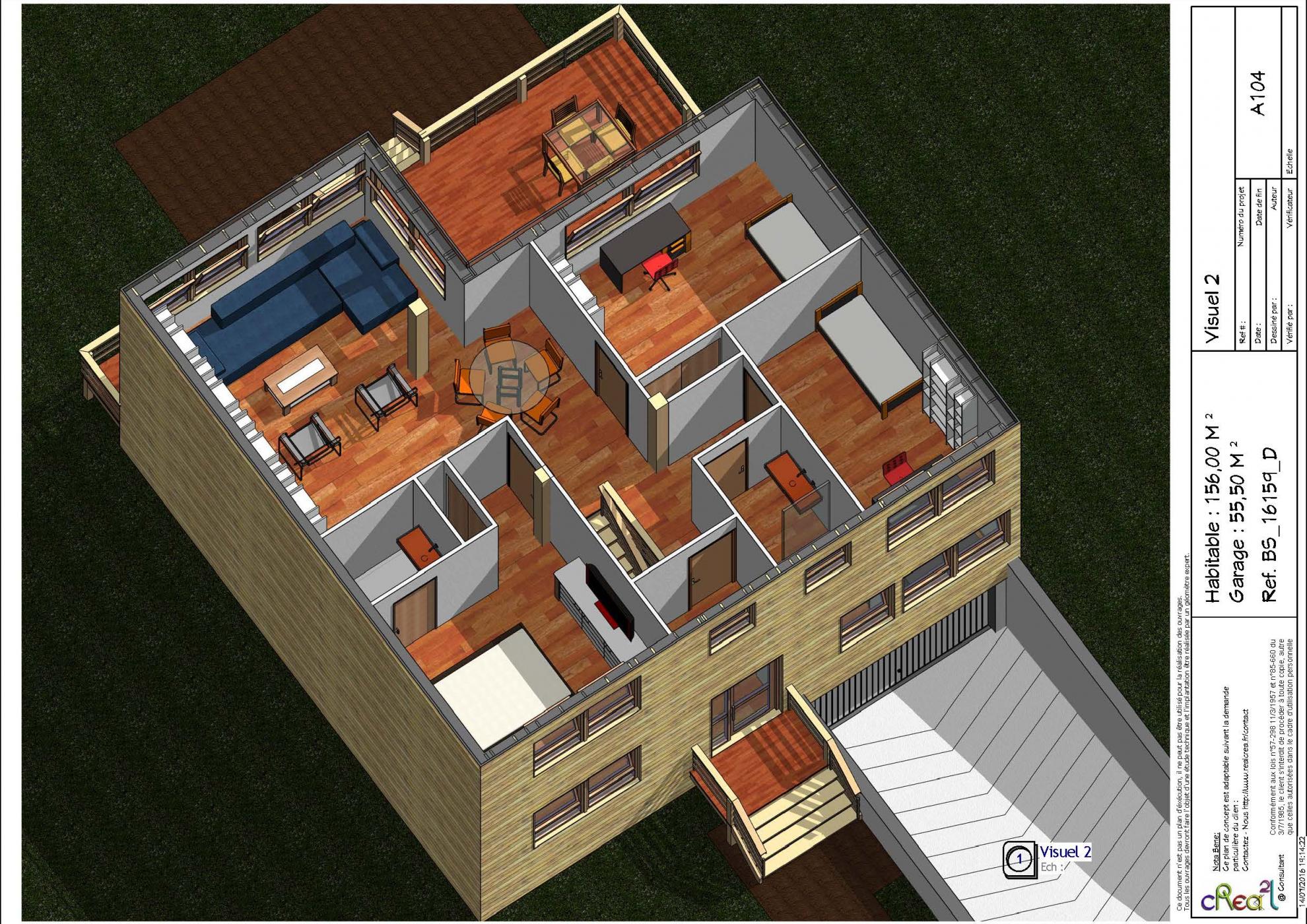 Plan BS_16159_D : Maison Bois contemporaine, T5, 156 m², 4 Chambres et 1 Suite, 2 séjours, Terrasse privative, sous sol complet, grand Garage.