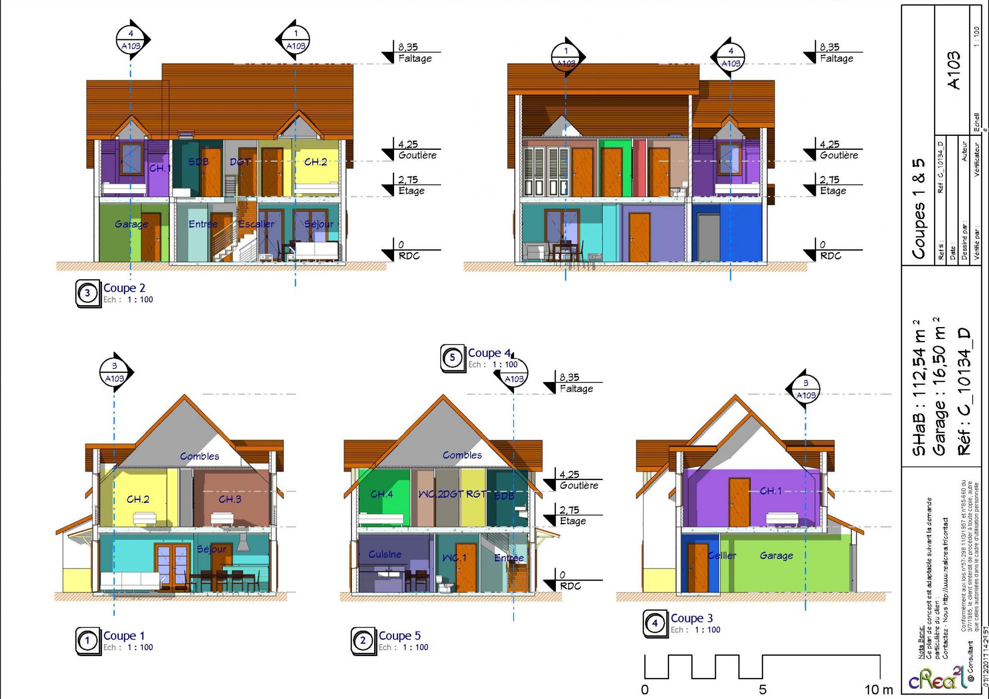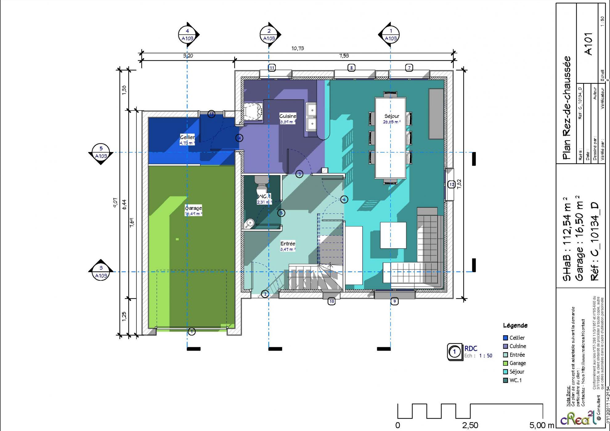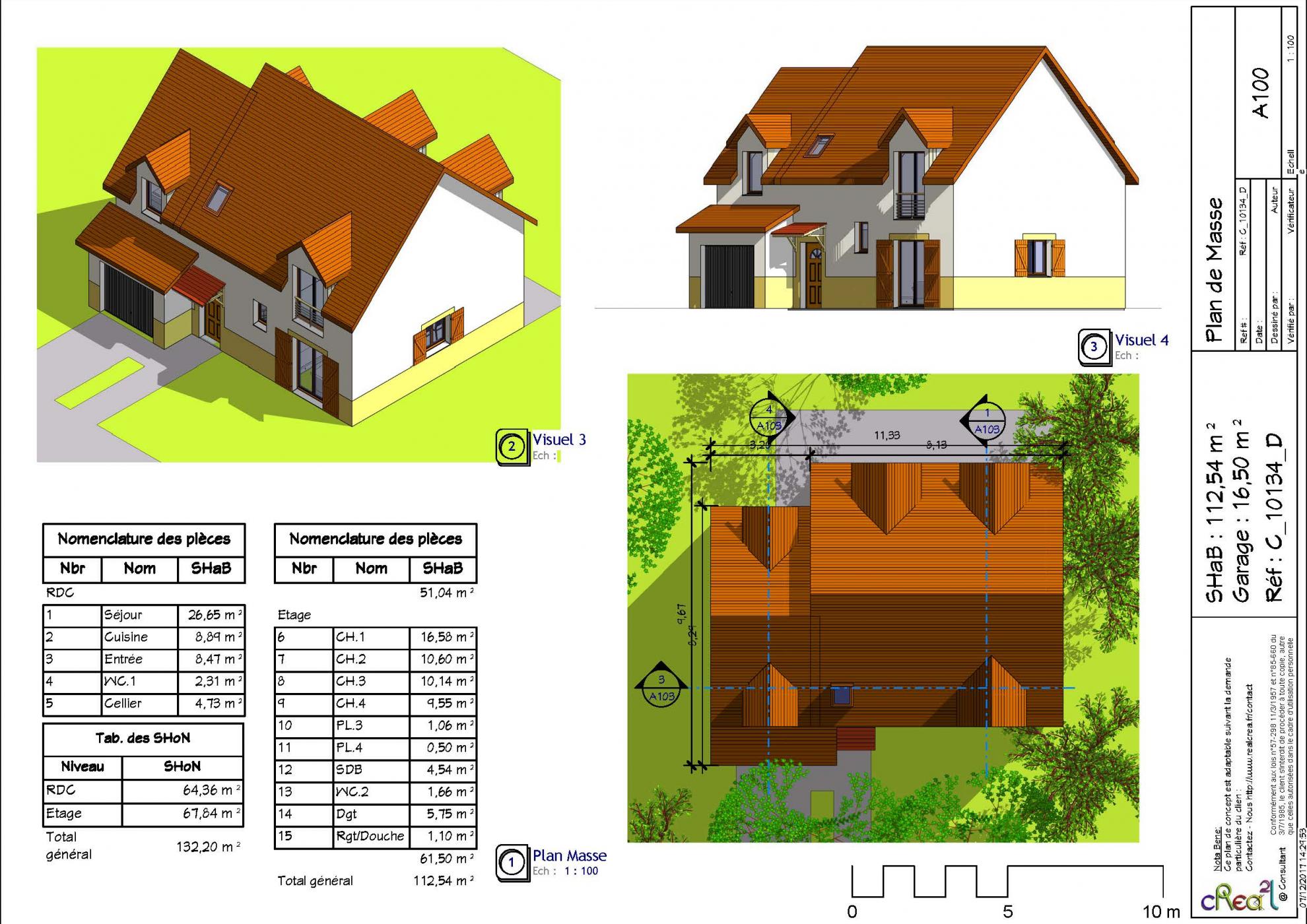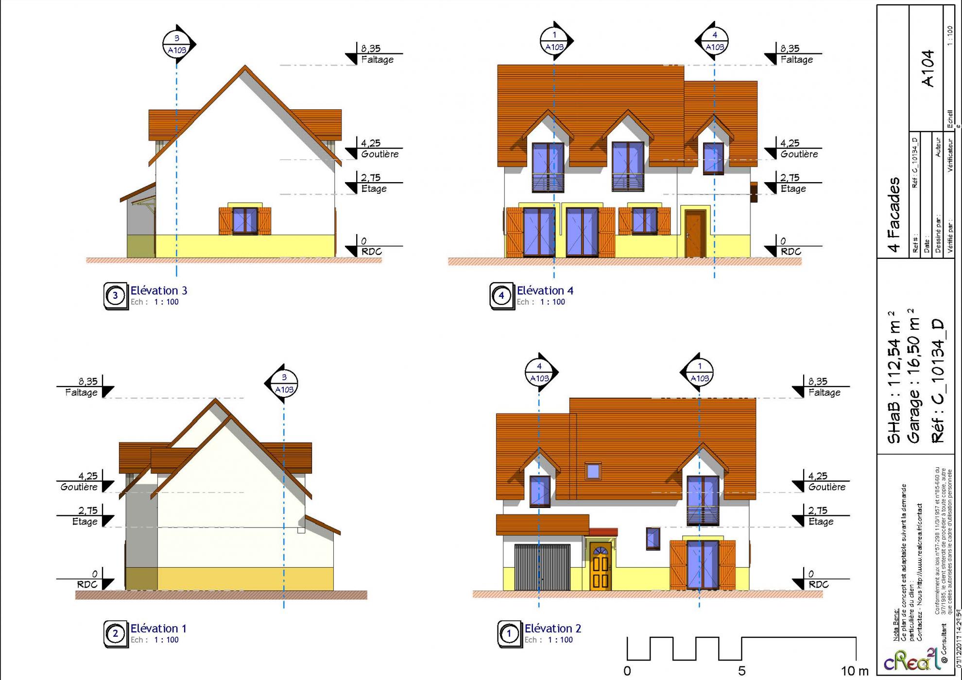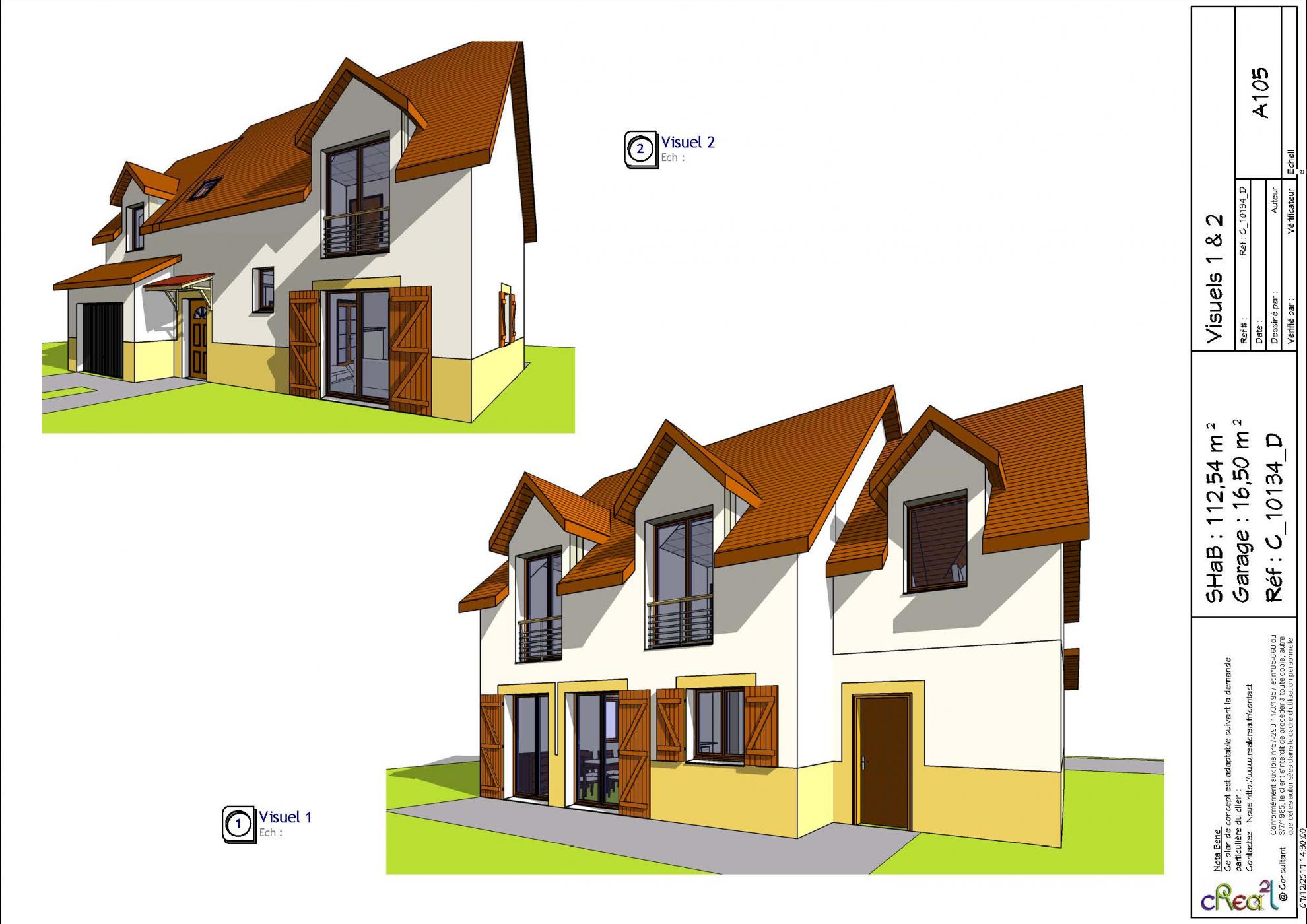 Plan C_10134_D : Maison R + Combles, 4 chambres ayant 112 m² habitables + garage intégré.