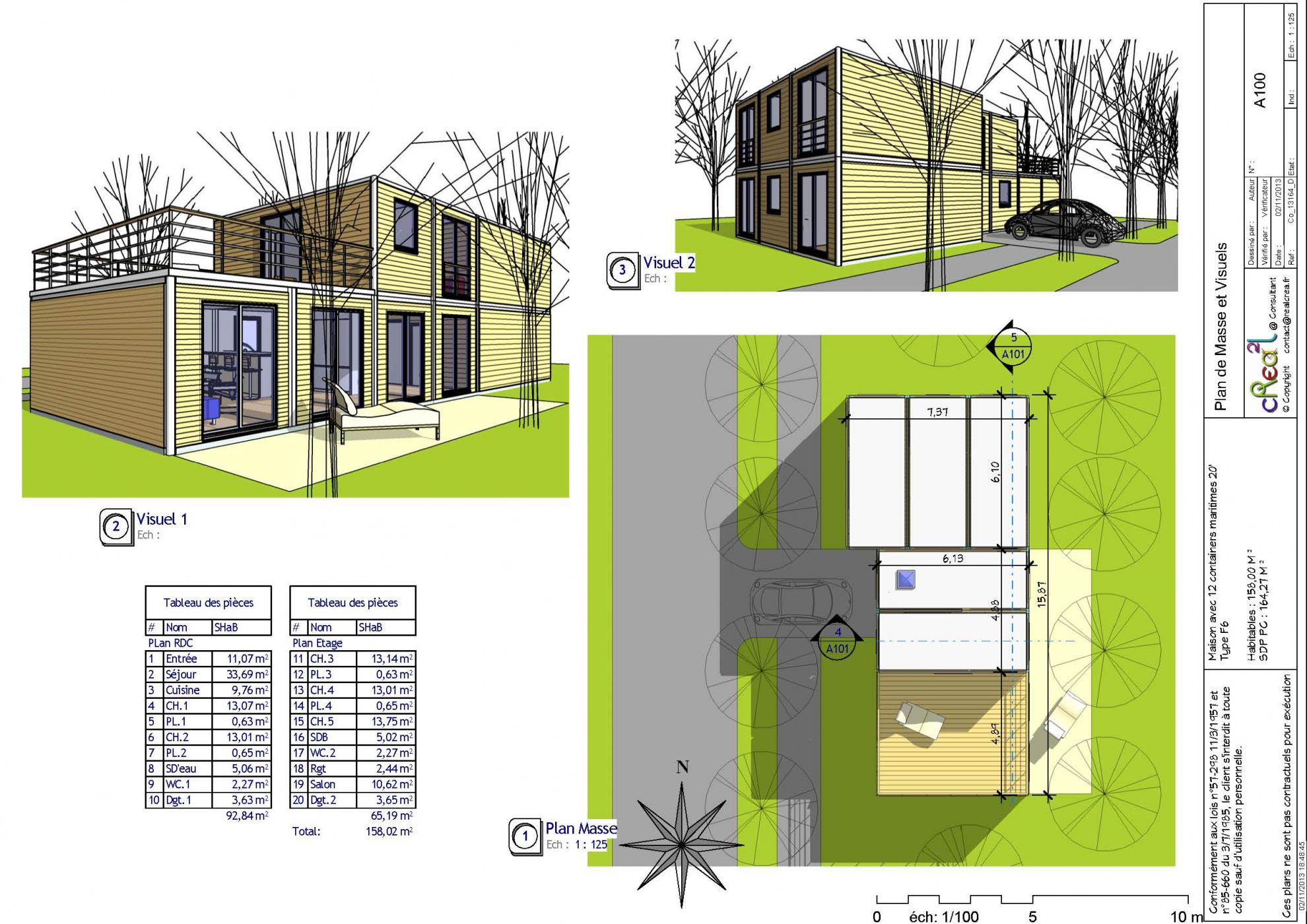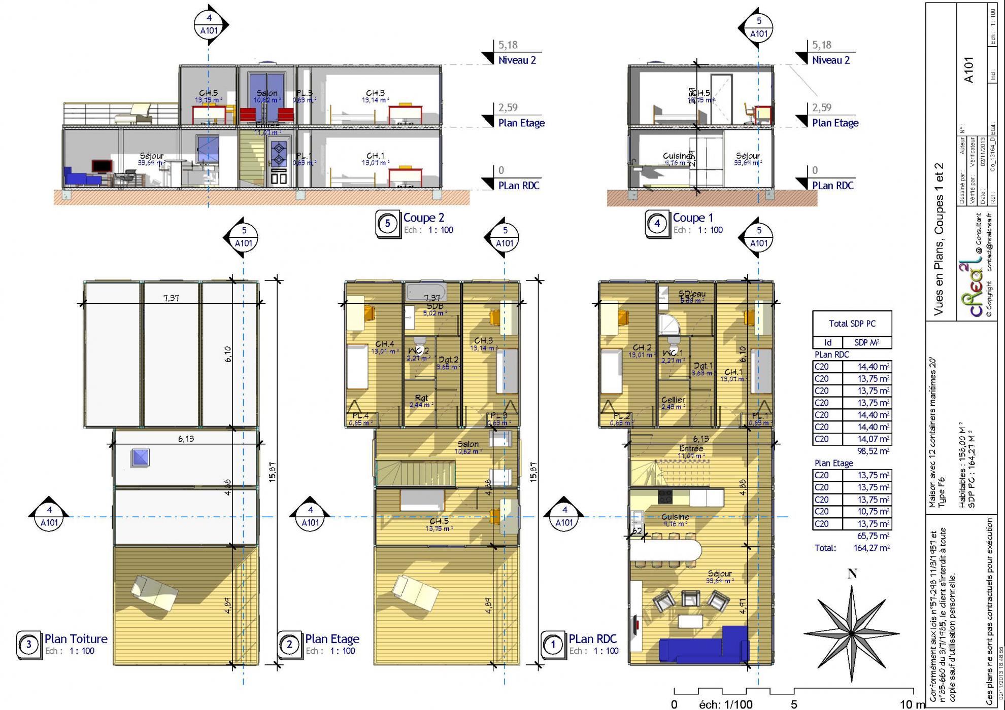 Plan Co_14183_D : Maison contemporaine R+1, 173 M², avec 15 Containers maritimes de 6 M, F5...